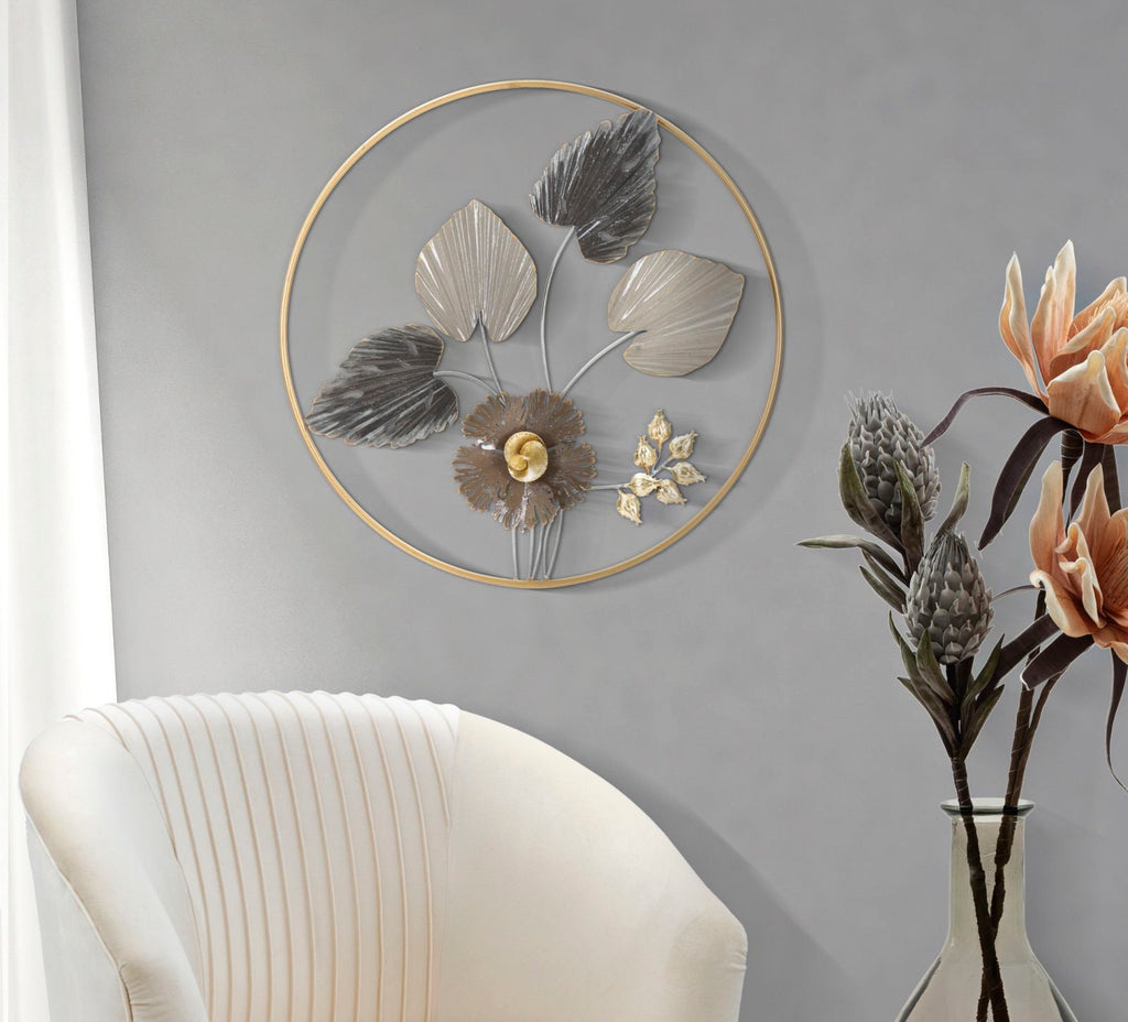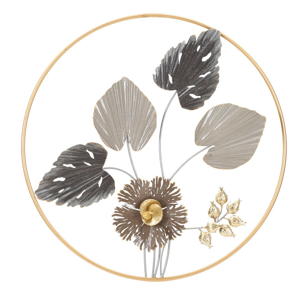 - Pannello decorativo circolare con composizione di foglie e fiori racchiusi, colori pastello e oro