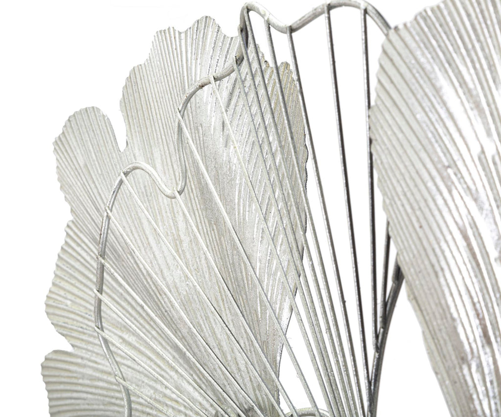 Silberne Metallplatte mit Blättern. 3D-Paneele sind der neue Trend für die Dekoration von Wänden. Lackiertes Metall ist in geometrischen, pflanzlichen oder tierischen Formen erhältlich, die jeder Umgebung einen glamourösen und überraschenden Reiz verleihen.