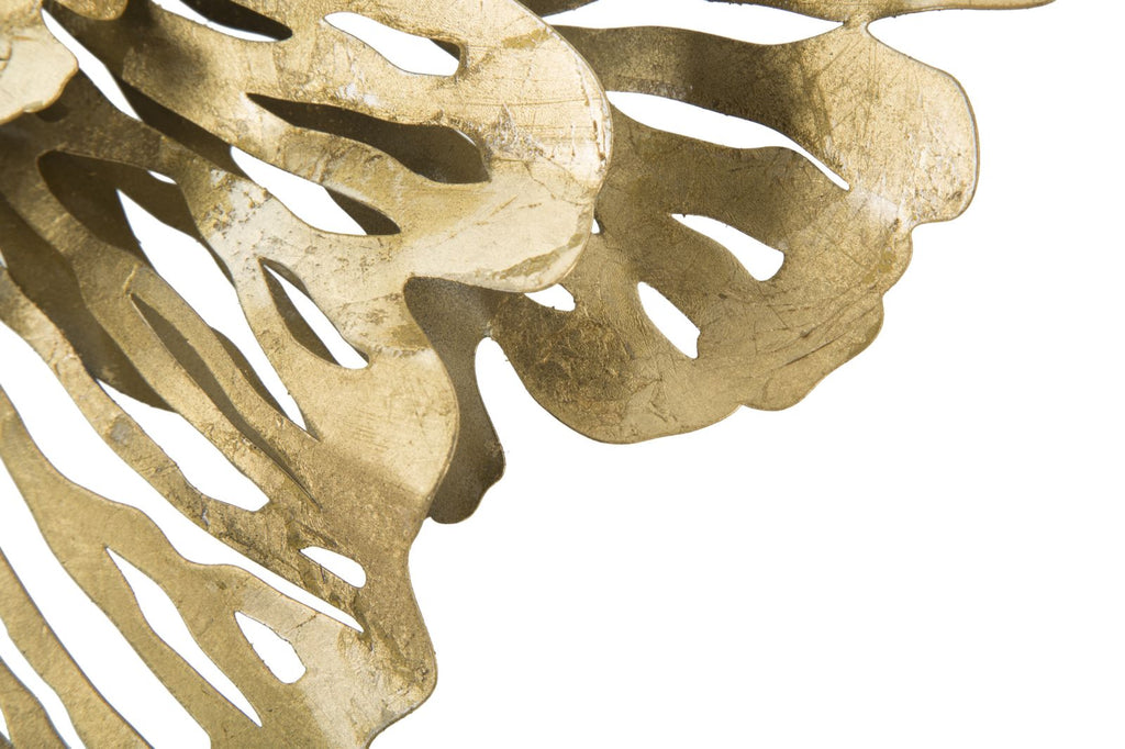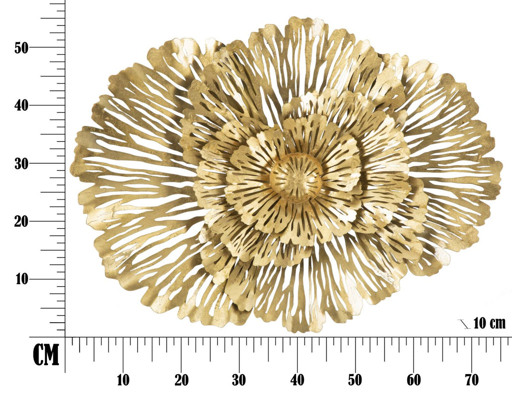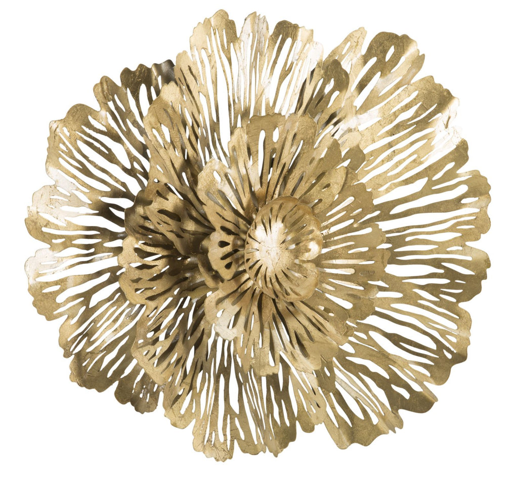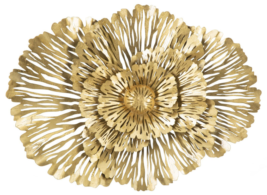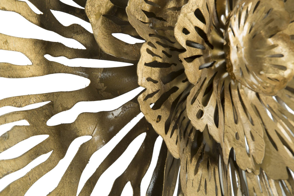 Blumenplatte aus goldenem Metall. 3D-Paneele sind der neue Trend für die Dekoration von Wänden. Das lackierte Metall ist in geometrischen, pflanzlichen oder tierischen Formen gehalten, die jeder Umgebung einen glamourösen und überraschenden Reiz verleihen