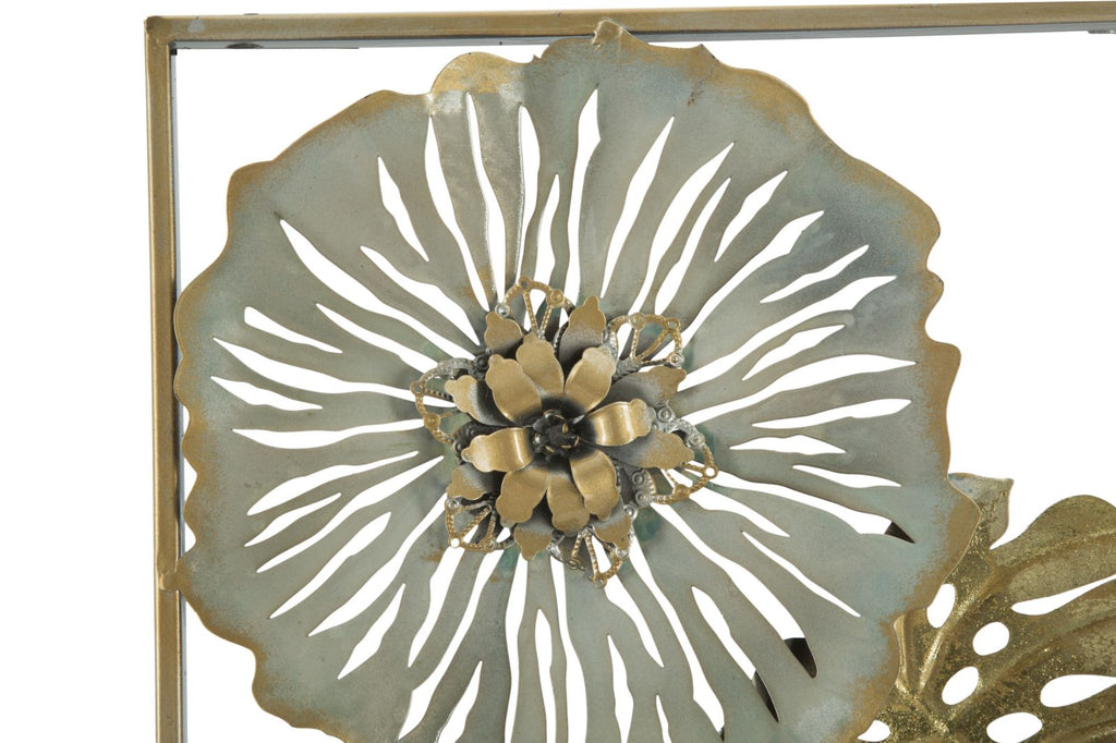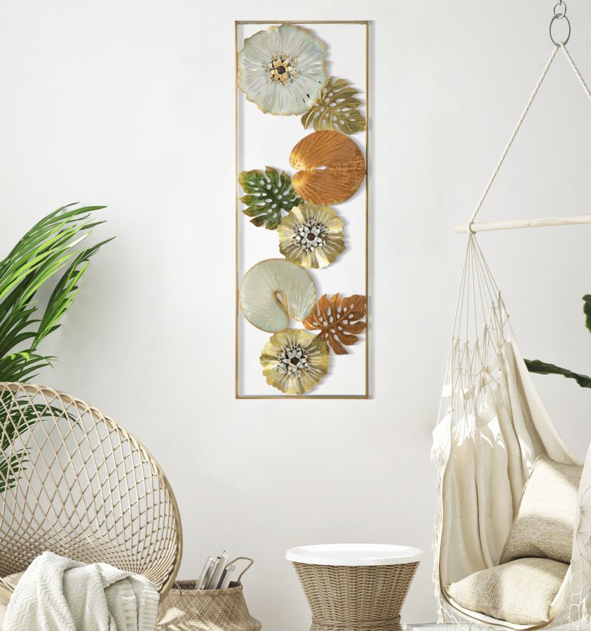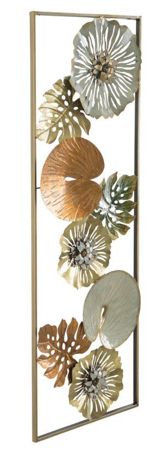 Rechteckige Metallplatte mit Blättern. 3D-Paneele sind der neue Trend für die Dekoration von Wänden. Das lackierte Metall ist in geometrischen, pflanzlichen oder tierischen Formen gehalten, die jeder Umgebung einen glamourösen und überraschenden Reiz verleihen
