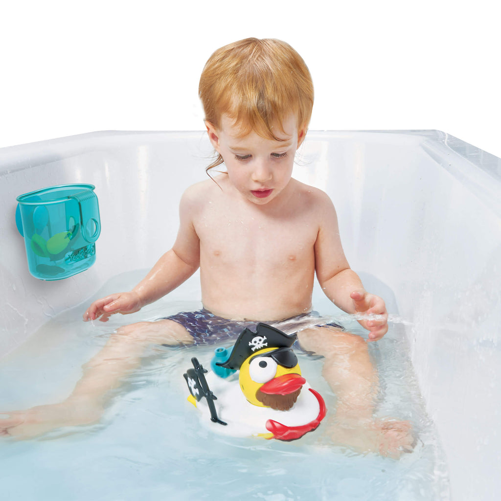 Eine batteriebetriebene Jet-Ente, die schnell in der Wanne schwimmt! Erstellen Sie verschiedene Charaktere mit 15 Piraten-Accessoires. Ausgestattet mit einem Behälter, der an der Wanne befestigt wird, um alle Spielsteine ordentlich aufzubewahren.