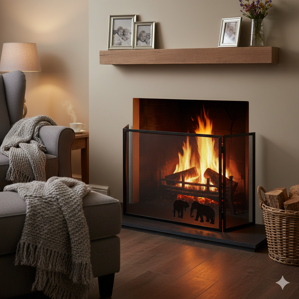 Parascintille per caminetto con parte centrale e 2 antine, cm 20+60+20xh50, realizzato con piatto in ferro mm 15x5 e rete stirata in ferro Sp. mm 0.8, verniciato colore grigio martellato, con tema decorativo rappresentante l'elefante sp. mm 2, Made in Italy, facile da pulire con un panno umido, montaggio non richiesto