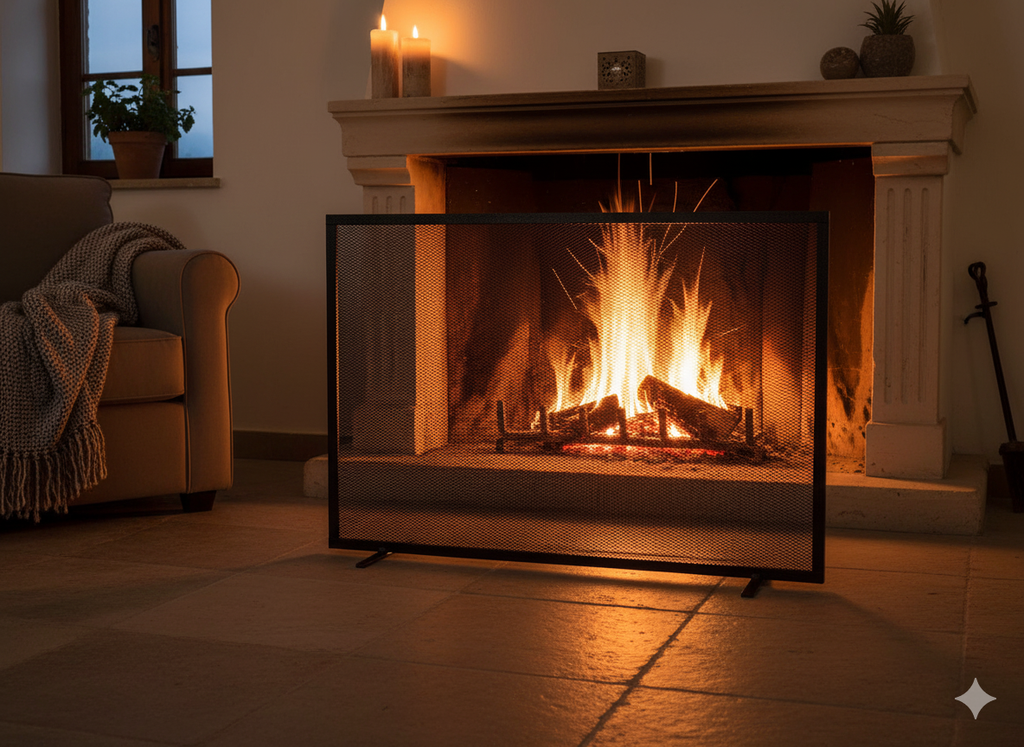 Parascintille per caminetto realizzato con piatto in ferro mm 15x5 e rete stirata in ferro Sp. mm 0.8, verniciato colore grigio martellato, Made in Italy,facile da pulire con un panno umido, montaggio non richiesto.