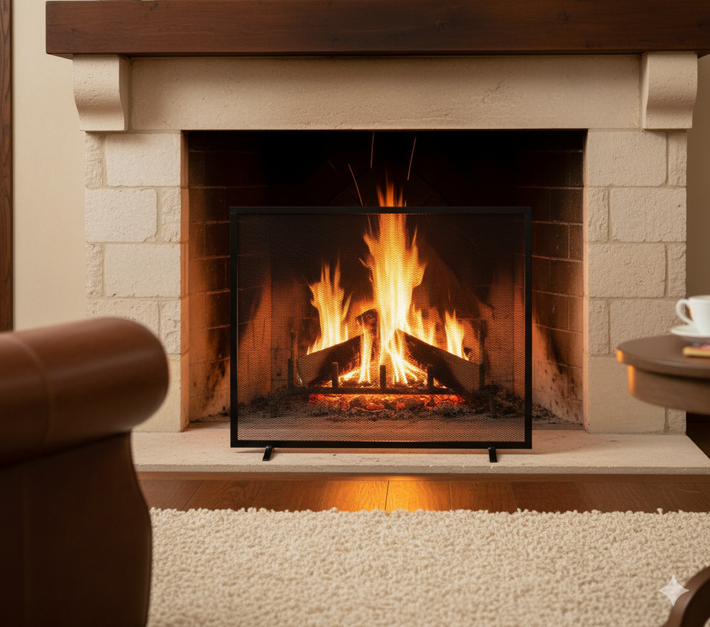 Parascintille per caminetto realizzato con piatto in ferro mm 15x5 e rete stirata in ferro Sp. mm 0.8, verniciato colore grigio martellato, Made in Italy,facile da pulire con un panno umido, montaggio non richiesto.