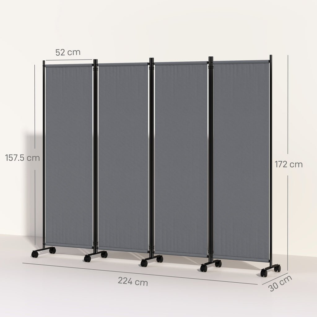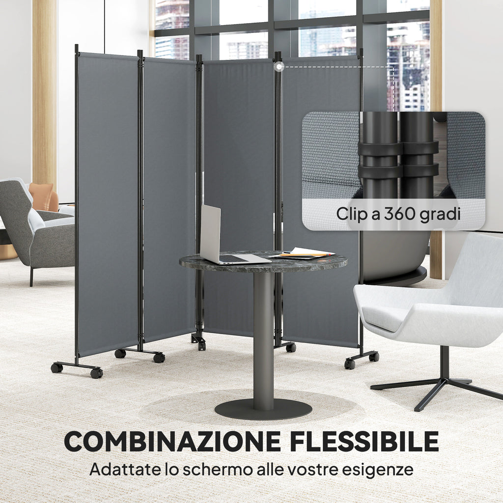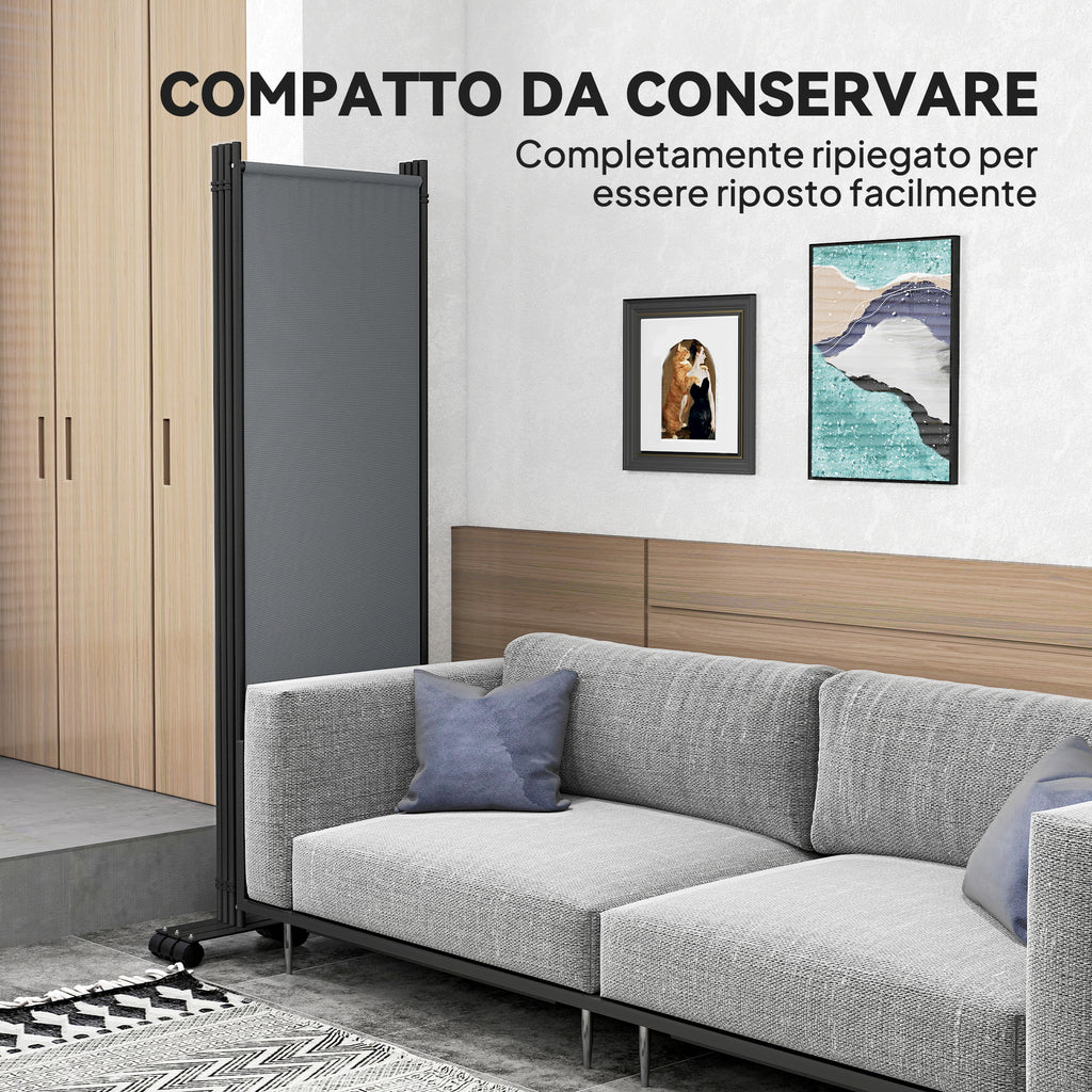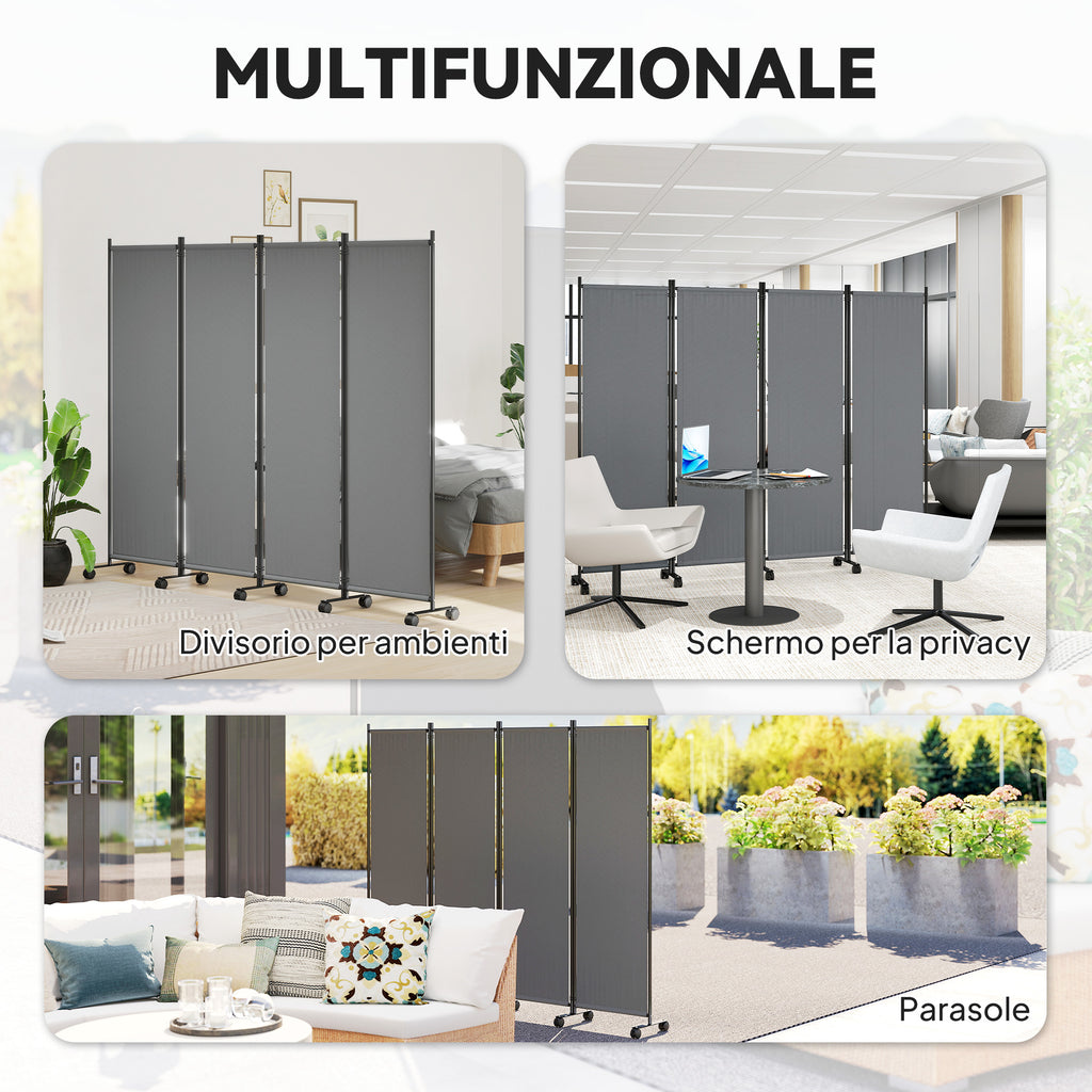 Paravento da Esterno e Interno a 4 Pannelli Pieghevole 221x50x172 cm con Ruote in Metallo e Poliestere Grigio Scuro