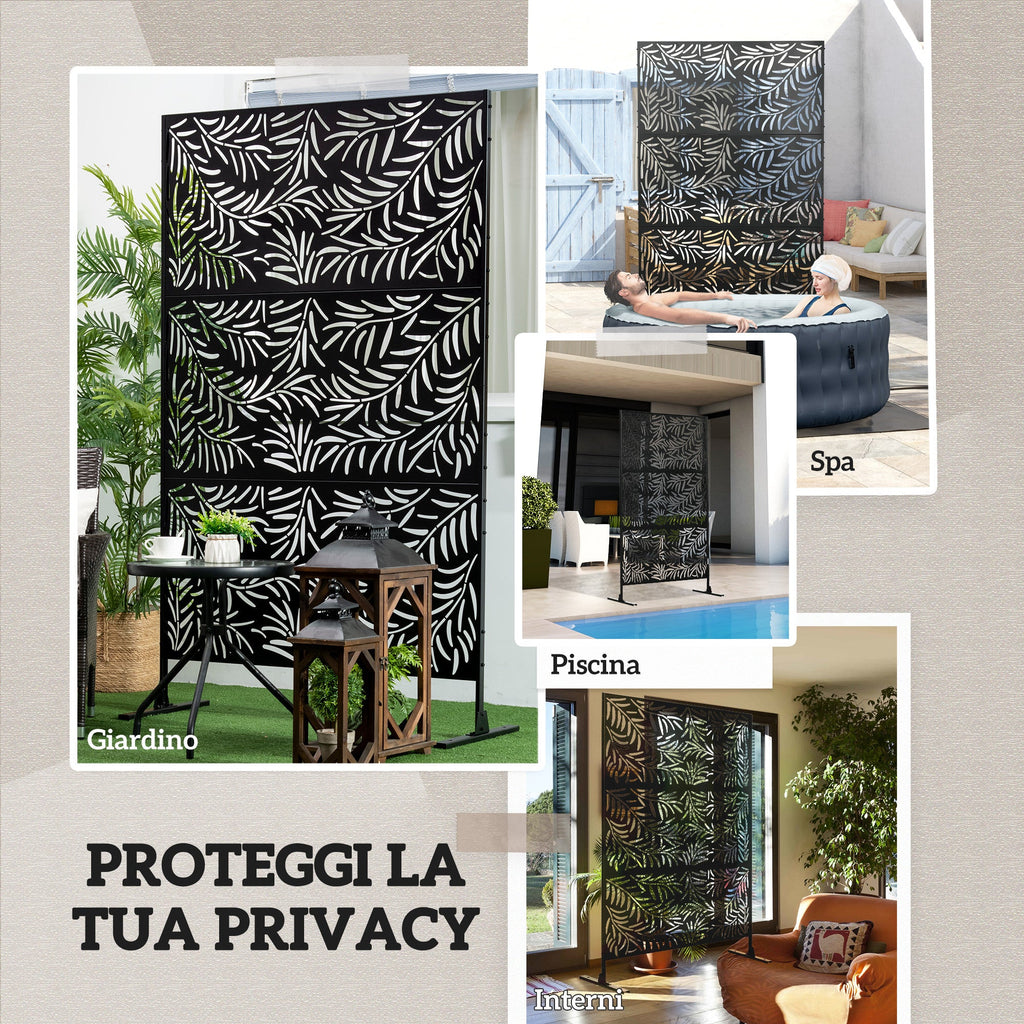 Il nostro paravento 122x198 cm aggiunge un tocco decorativo ed elegante ad ogni spazio esterno, creando il giusto livello di privacy per te e i tuoi ospiti. Realizzato in acciaio robusto con un design traforato che raffigura una pianta di salite, il divisorio si armonizza perfettamente con il contesto del giardino. La struttura è dotata di 2 gambe lunghe per garantire una maggiore stabilità. Paravento con telaio in acciaio con vernice protettiva per uso esterno. Divisorio ambiente con motivi di rami di salice intagliati per creare un aspetto piacevole. Struttura indipendente con due piedi per garantire l'equilibrio. 4 viti di espansione incluse nella confezione. Il divisorio da esterno crea un'area divisa in giardino o nel patio, ma è utilizzabile anche all'interno. Per avere maggiore stabilità, occorre aggiungere pesi. Montaggio richiesto.