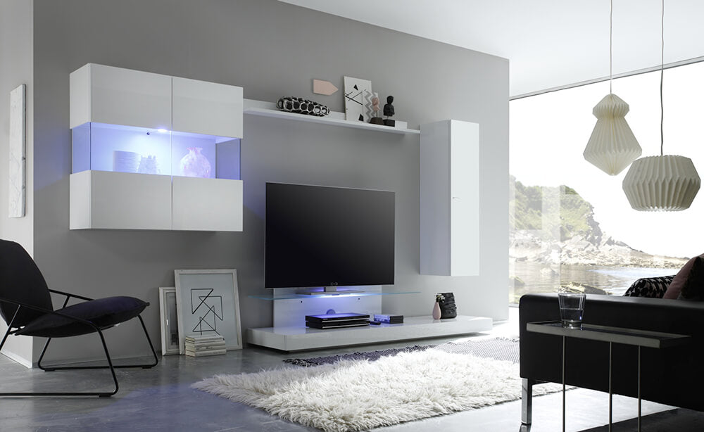 Ausgestattete Wand Wohnzimmermöbel mit 2 Hängemöbeln 1 TV Schrank mit Glasboden 1 Regalboden 320x50x175cm TFT Line Glossy White