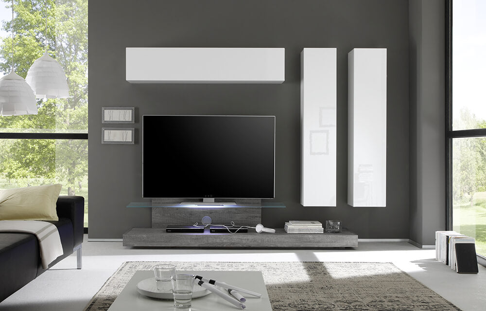 Ausgestattete Wand Wohnzimmermöbel 3 Hängemöbel 1 TV-Schrank Regal 185x225x51cm TFT Cube Glänzend Weiß und Graue Eiche