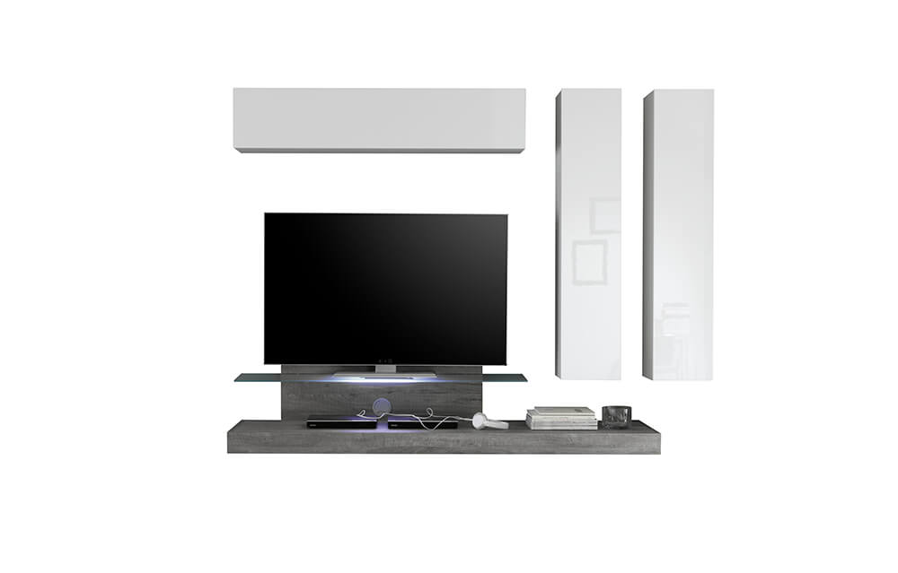 Ausgestattete Wohnzimmerwand mit 3 Hängemöbeln und 1 TV-Schrank mit Ablage 185x225x51cm TFT Cube Glänzend Weiß und Graue Eiche
