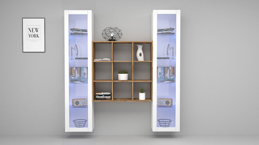 Questo soggiorno è composto da due vetrine e una libreria centrale color rovere. Le vetrine hanno un'anta con telaio e 4 ripiani in vetro. Il soggiorno MARUSKA n° 28 è in grado di adattarsi a qualsiasi stile di arredo. Viene fornito in un kit di montaggio con istruzioni semplici e dettagliate. La parete soggiorno MARUSKA n° 28 da 170 cm può essere montata sia a pavimento che sospesa, si distingue come un complemento d'arredo in grado di creare un soggiorno dal design inconfondibile e 100% Made in Italy.