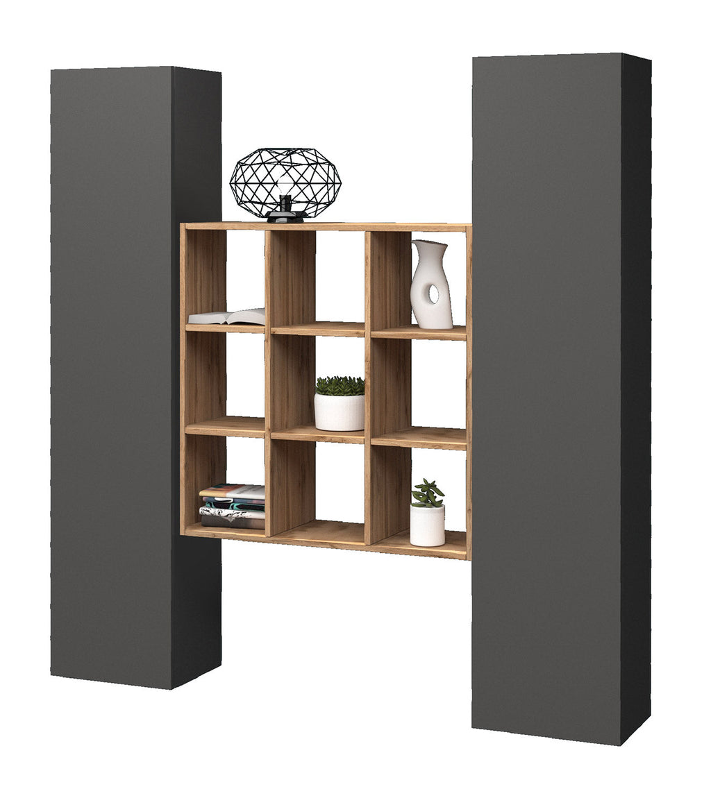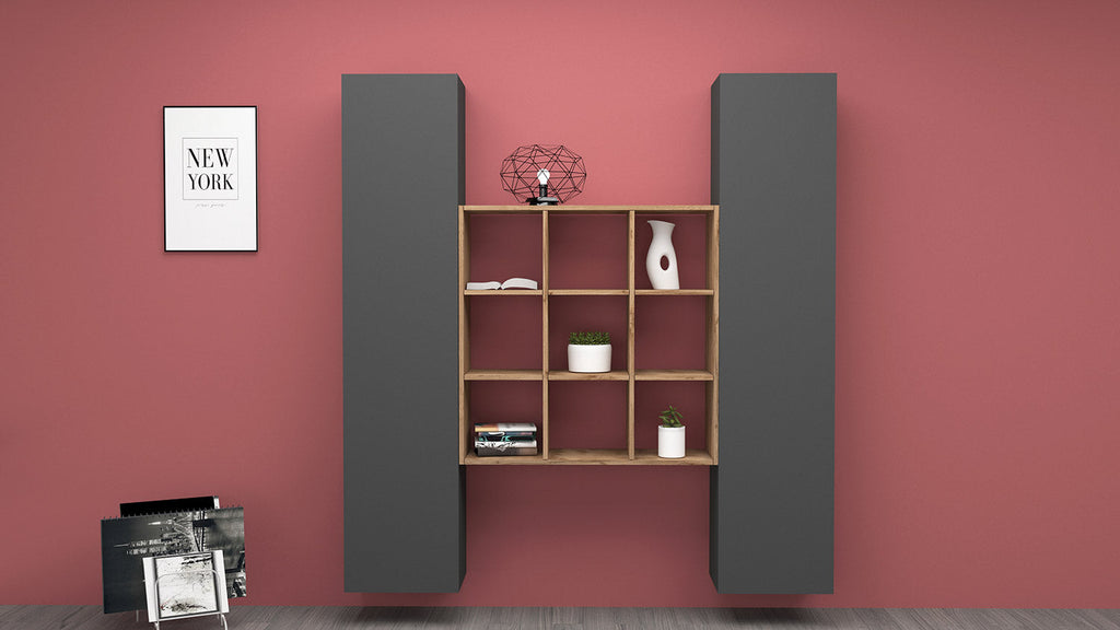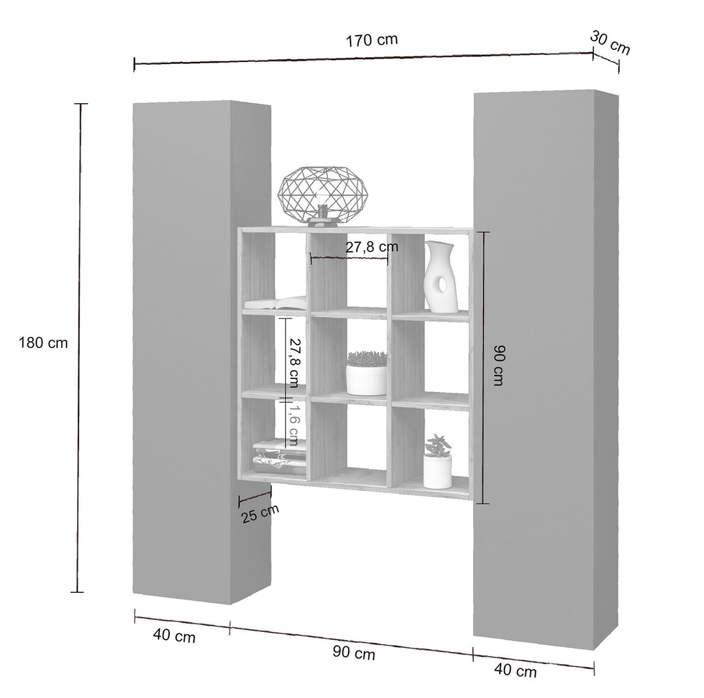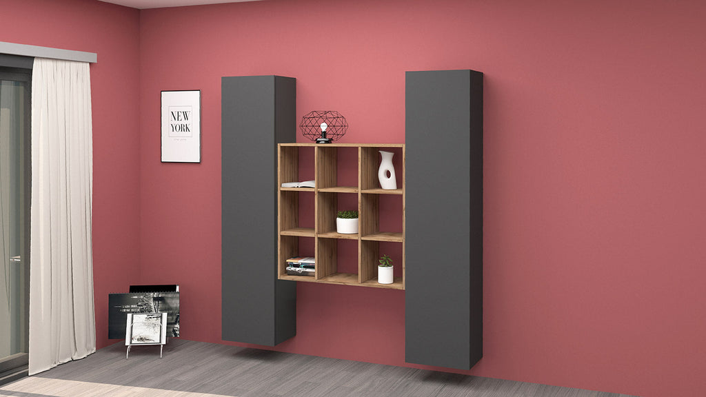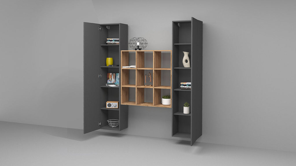 Il soggiorno MARUSKA n°31 da 170 cm è caratterizzato da una parete con 2 colonne armadio e una libreria 9 vani. La parete del soggiorno può essere montata sia a terra che appesa. Le colonne armadio hanno 1 anta battente e all’interno, 4 ripiani in legno. Il soggiorno è realizzato in melaminico bianco laccato lucido o antracite opaco, la libreria invece è in legno rovere wotan. Il soggiorno MARUSKA n° 31 è adattabile a ogni stile di arredamento, con un design innovativo che riesce facilmente a stare con altre tipologie di mobili. All’interno della confezione si trovano un kit di montaggio e delle istruzioni semplici e dettagliate.