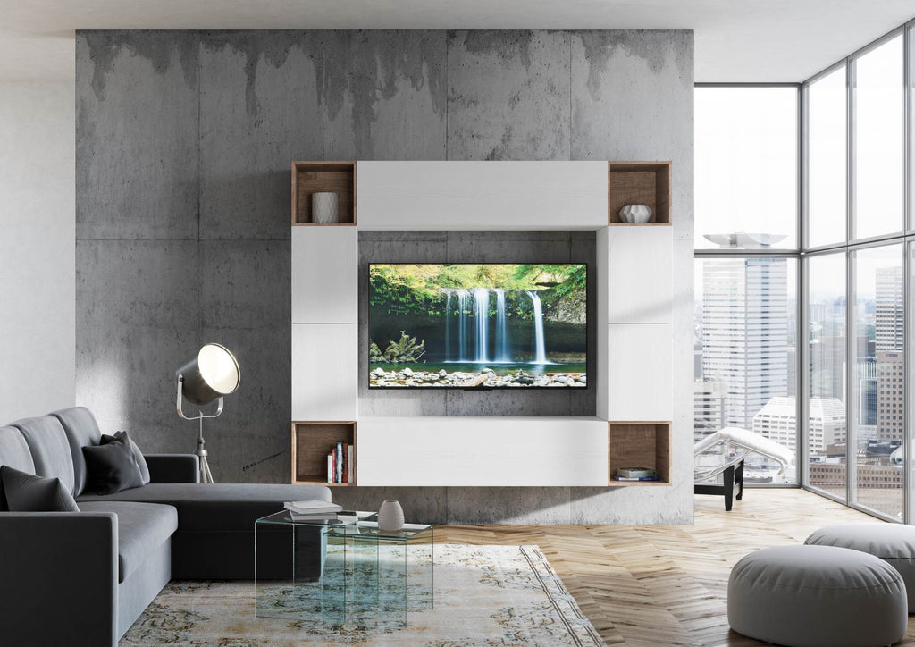 La parete attrezzata Isoka A05 può essere fissata al muro esattamente come la vedi nelle immagini, oppure puoi personalizzarla a tuo piacimento: i singoli elementi possono essere collocati nella posizione che preferisci.