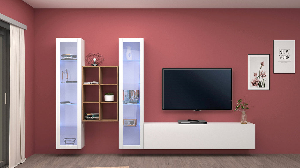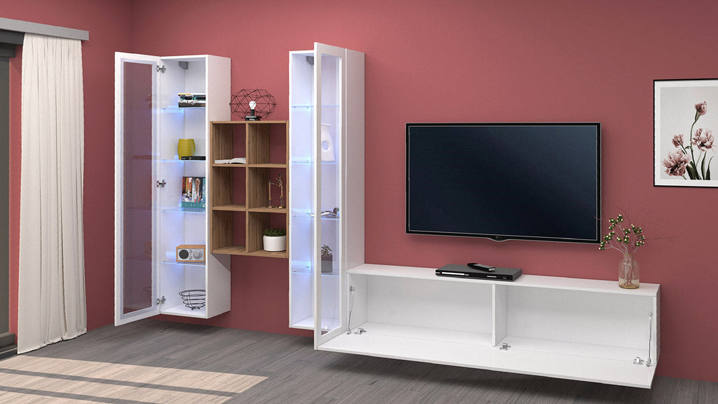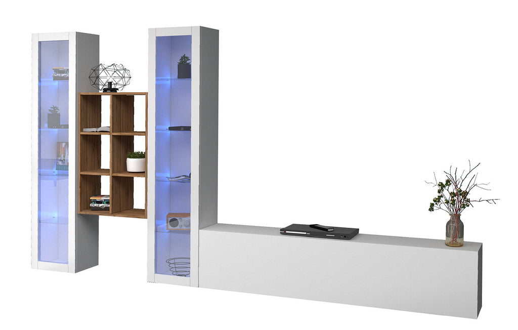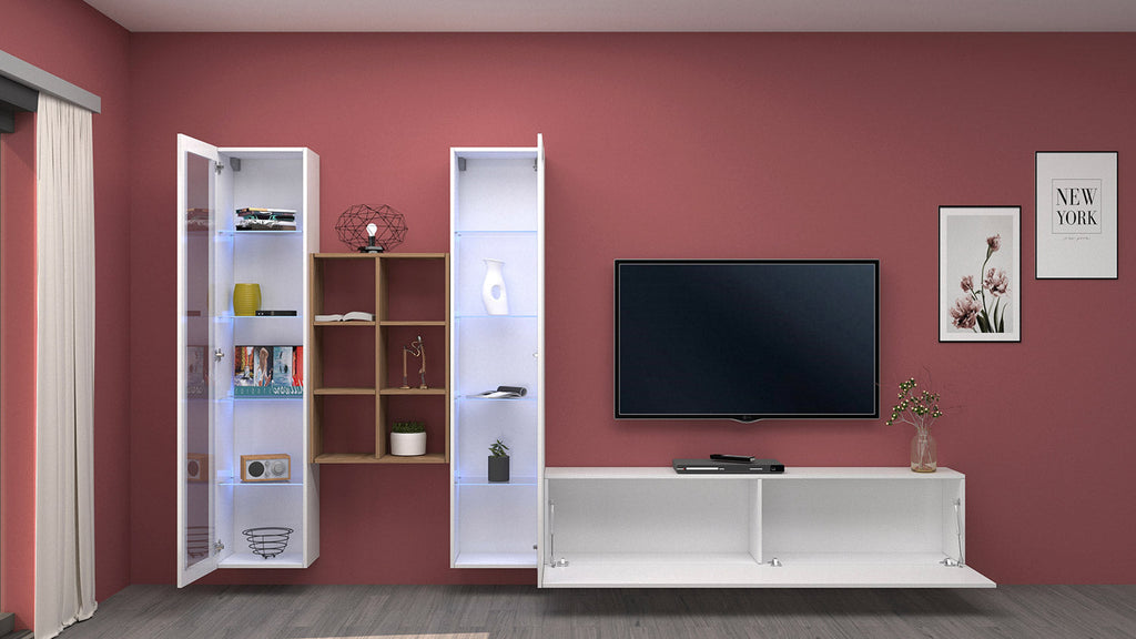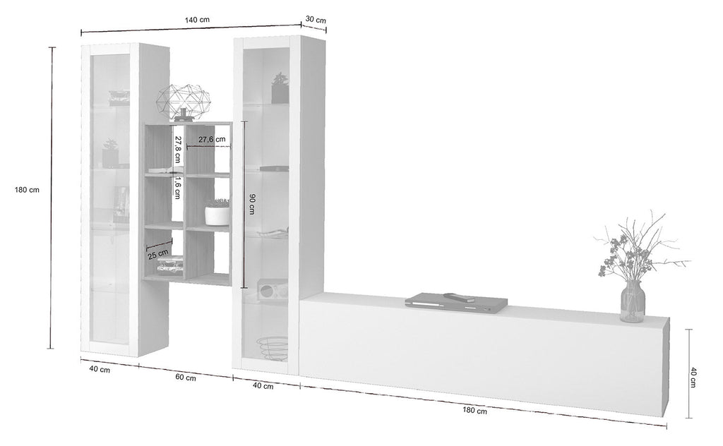 Il soggiorno MARUSKA n°18 da 320 cm è caratterizzato da 2 vetrine, 1 mobile porta TV e una libreria a 6 vani. La parete può essere montata sia che tocchi terra, oppure appesa. Le vetrine invece, sono formate da 1 anta telaio con vetro e al loro interno hanno 4 ripiani in vetro. Il mobile porta tv ha 1 anta a ribalta, regolata con dei braccetti a gas e può essere montata sia a destra che a sinistra. L’intero soggiorno è realizzato in melaminico bianco laccato lucido o antracite opaco, mentre la libreria è realizzata in rovere wotan. Il soggiorno MARUSKA n° 18 si adatta in maniera perfetta a qual sia si stile d'arredo, grazie alla sua forma innovativa. La confezione ha al suo interno un kit di montaggio con istruzioni semplici da seguire.