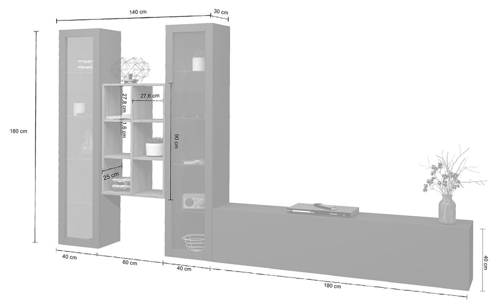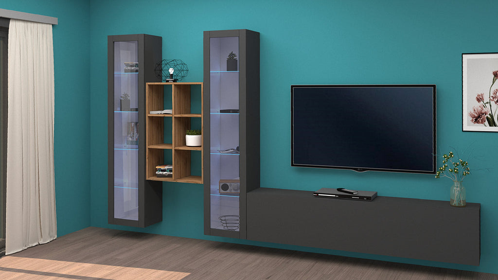 Il soggiorno MARUSKA n°18 da 320 cm è caratterizzato da 2 vetrine, 1 mobile porta TV e una libreria a 6 vani. La parete può essere montata sia che tocchi terra, oppure appesa. Le vetrine invece, sono formate da 1 anta telaio con vetro e al loro interno hanno 4 ripiani in vetro. Il mobile porta tv ha 1 anta a ribalta, regolata con dei braccetti a gas e può essere montata sia a destra che a sinistra. L’intero soggiorno è realizzato in melaminico bianco laccato lucido o antracite opaco, mentre la libreria è realizzata in rovere wotan. Il soggiorno MARUSKA n° 18 si adatta in maniera perfetta a qual sia si stile d'arredo, grazie alla sua forma innovativa. La confezione ha al suo interno un kit di montaggio con istruzioni semplici da seguire.