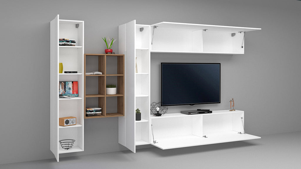 Il soggiorno MARUSKA n°20 da 320 cm è caratterizzato da 2 colonne armadio, 1 mobile porta tv, 1 vasistas e una libreria a 6 vani. La colonna armadio ha 1 anta battente con all’interno 4 ripiani di legno. La parete del soggiorno invece, può essere montata sia a terra che appesa. Il porta tv e la vasistas hanno, in ordine, 1 anta ribalta ed 1 anta vasistas, regolate con dei braccetti a gas e possono essere montati sia a destra che a sinistra. La libreria è realizzata in rovere wotan, mentre l’intero soggiorno è realizzato in melaminico bianco laccato lucido o antracite opaco. Il soggiorno MARUSKA n° 20, grazie alla sua forma innovativa, si adatta perfettamente a qual sia si tipo di arredamento della stanza. La confezione è dotata di un kit di montaggio con istruzioni semplici da seguire.
