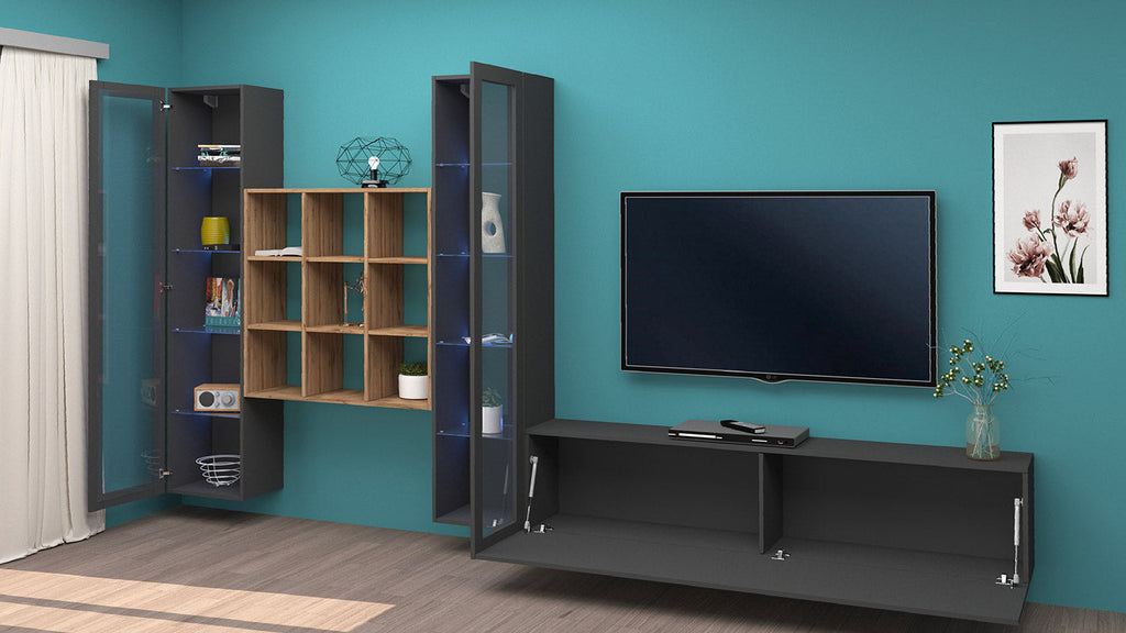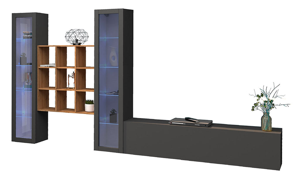 Il soggiorno MARUSKA n°27 da 350 cm è caratterizzato da una parete con 2 vetrine, 1 mobile porta tv e una libreria 9 vani. La parete del soggiorno può essere montata sia a terra che appesa. Le vetrine hanno 1 anta telaio con vetro e al suo interno 4 ripiani, realizzati anch’essi in vetro. Il mobile porta tv è dotato di 1 anta a ribalta, regolata da dei braccetti a gas: può essere montato a destra o a sinistra. Il soggiorno è interamente realizzato in melaminico bianco laccato lucido o antracite opaco, la libreria invece, è il legno rovere wotan, certificato FSC. Il soggiorno MARUSKA n° 27, con le sue forme moderne si adatta a qual sia si tipologia di arredamento. All’interno della confezione si trovano un kit di montaggio e delle istruzioni, facili da seguire anche per i non esperti.
