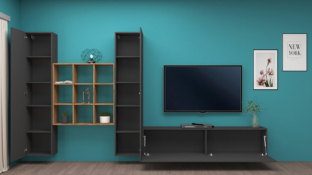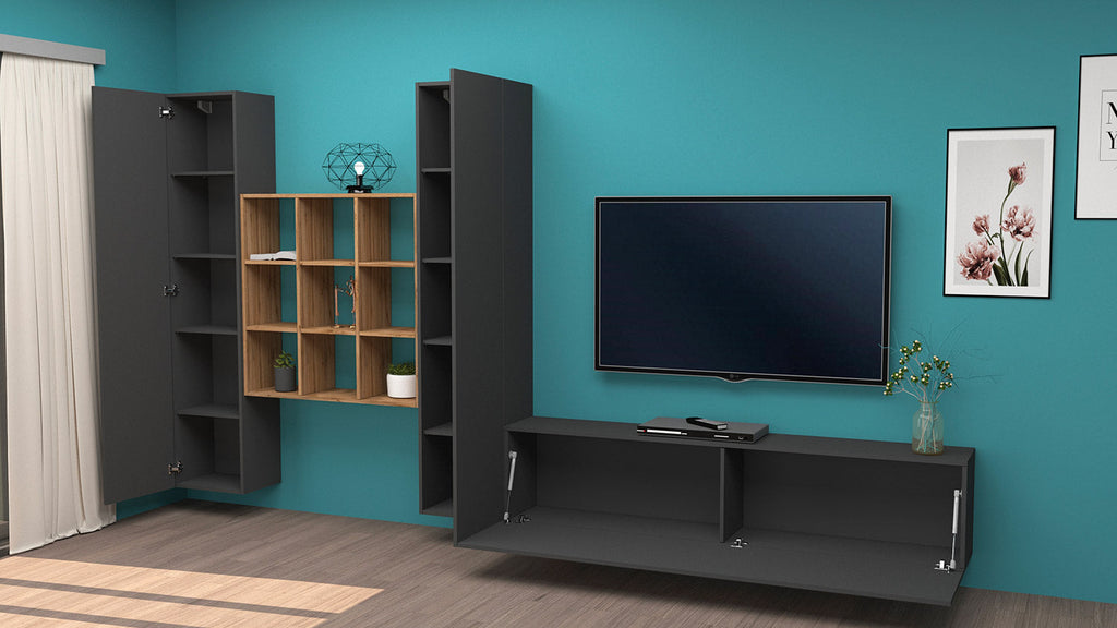 Il soggiorno MARUSKA n°30 da 350 cm è caratterizzato da una parete con 2 colonne armadio, 1 porta tv, e una libreria 9 vani. La parete del soggiorno può essere montata sia a terra che appesa. Le colonne armadio hanno 1 anta battente e all'interno sono dotate di 4 ripiani in legno. Il mobile porta tv è dotato di 1 anta ribalta, regolata da dei braccetti a gas. Può essere montato a destra o a sinistra. Il soggiorno comples sivamente è realizzato in melaminico bianco laccato lucido o antracite opaco, anche se la libreria è in rovere wotan. Il soggiorno MARUSKA n° 30 si adatta a ogni tipo di arredamento, provvisto di un design innovativo. All’interno della confezione si trovano: un kit di montaggio e delle istruzioni semplici e dettagliate.