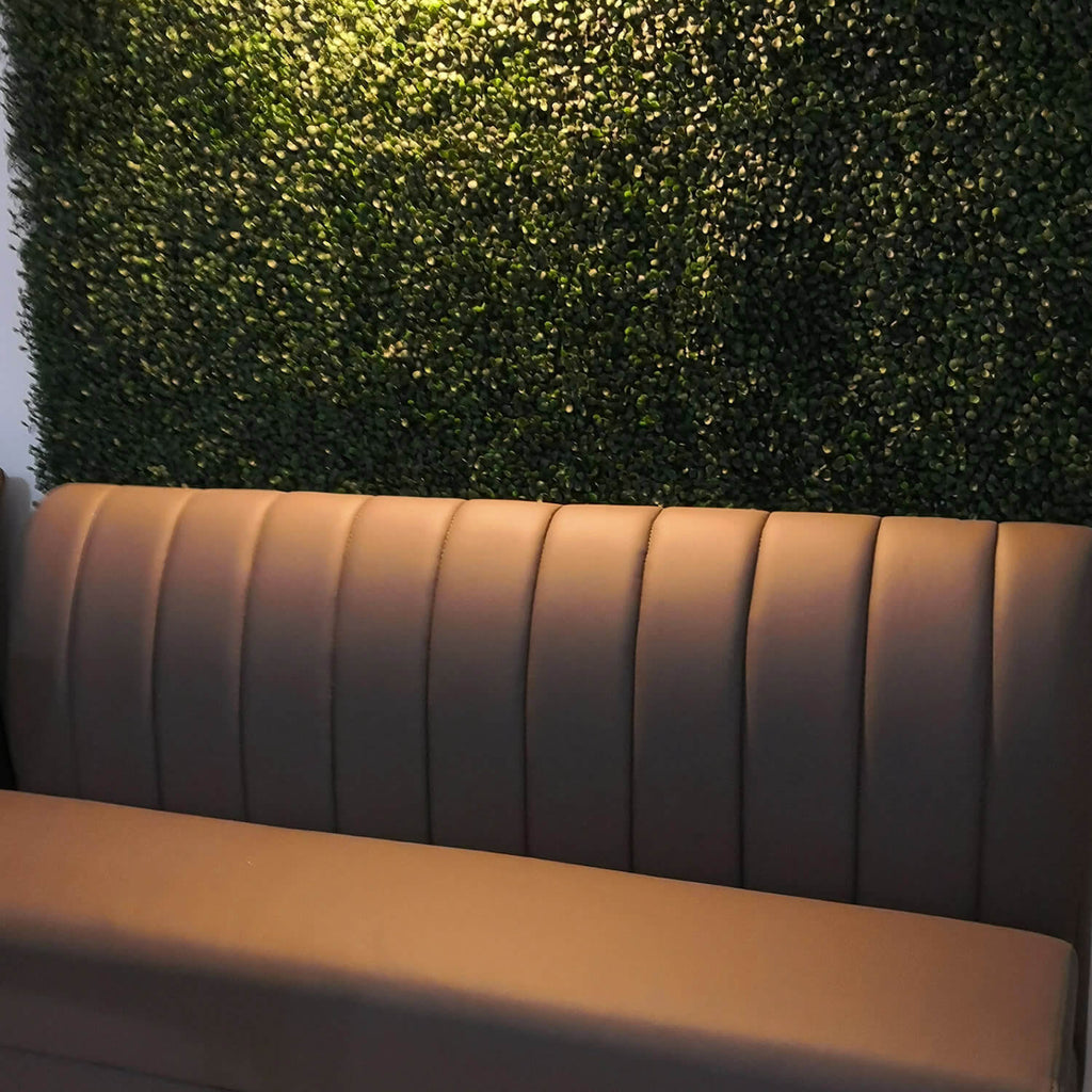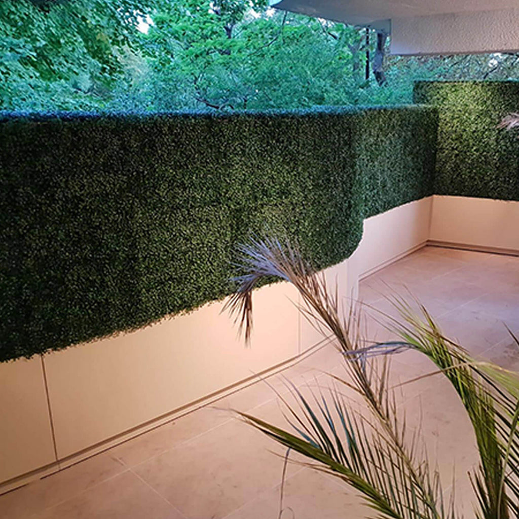Künstliche grüne Paneele lassen sich hervorragend an Säulen, Wänden oder Decken anbringen, um den Eindruck zu erwecken, fast im Freien zu sein. Die Komposition ist einfach, so dass sie sich an jede Umgebung anpassen lässt, intim und vertraut oder modern und schick. Es ist mit schnellen und unsichtbaren Verbindungsclips ausgestattet, um die Montage zu erleichtern, aber auch um verschiedene Kombinationen erstellen zu können, um Ihren Platz so einzigartig wie möglich zu machen. Die Materialien, aus denen es hergestellt wird, machen es zu einem perfekten Paneel für den Innenbereich, aber auch für den Außenbereich, das schlechtem Wetter und UV-Strahlen widerstehen kann.