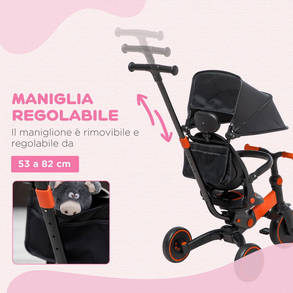 - COMPLETAMENTE REGOLABILE: Il maniglione è regolabile in altezza da 53 a 82 cm, per adattarsi all'altezza degli adulti. Il triciclo con maniglione è dotato anche di un tettuccio parasole regolabile, per proteggere i piccoli dal sole a ogni ora del giorno. Il sedile può essere girato verso il maniglione, così i bimbi potranno vedere i genitori che spingono il triciclo in modalità passeggino. Lo schienale può anche essere reclinato fino a 140° per il comfort dei bambini