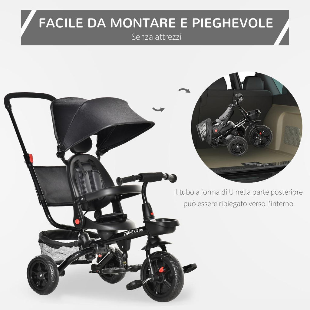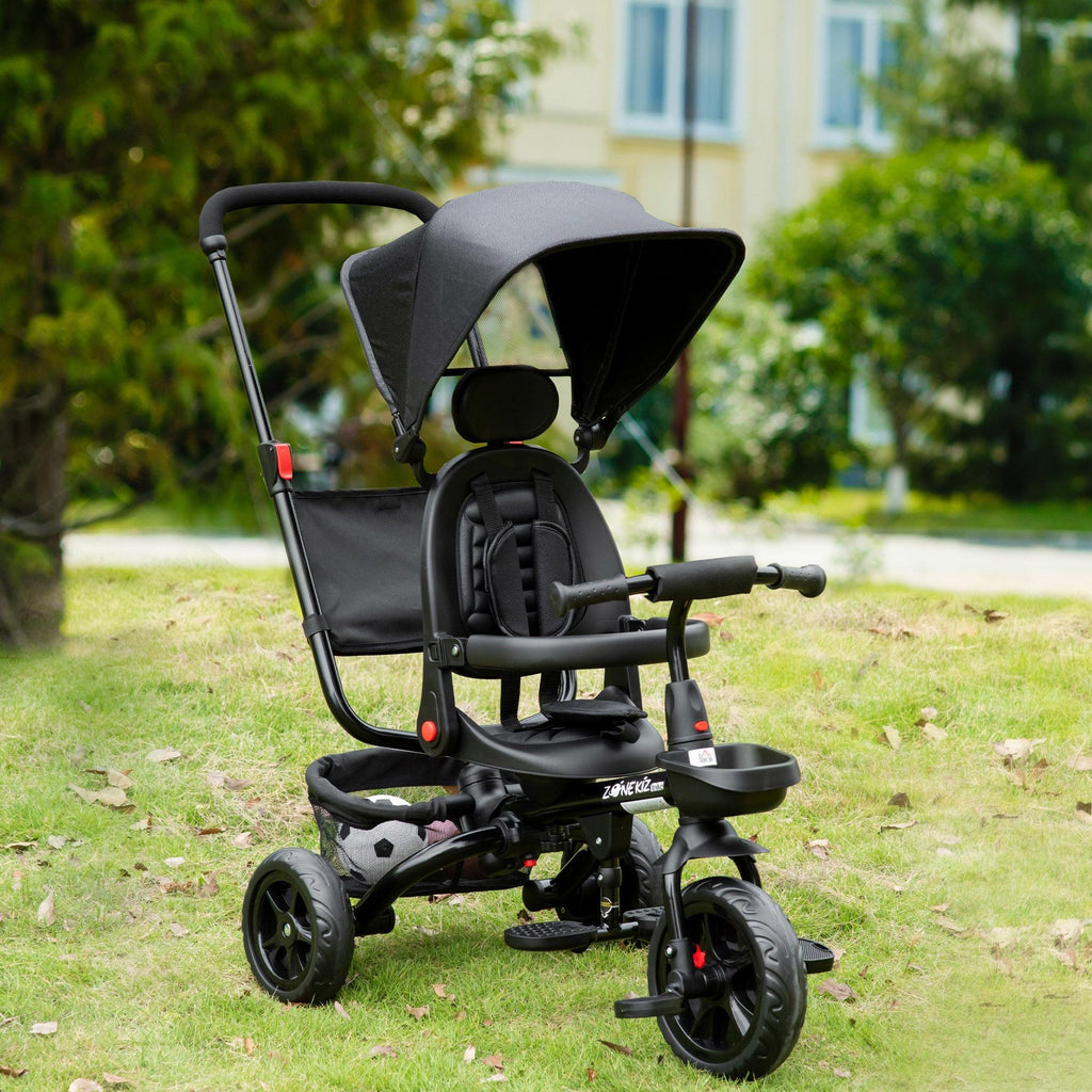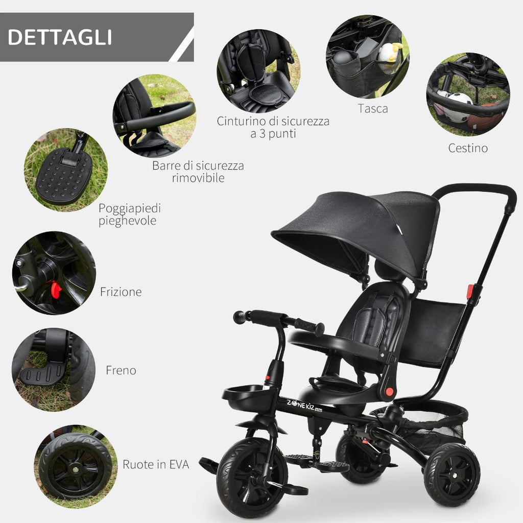 Dreirad-Kinderwagen mit 360° drehbarem Sitz, abnehmbarem Verdeck und Bügel Schwarz