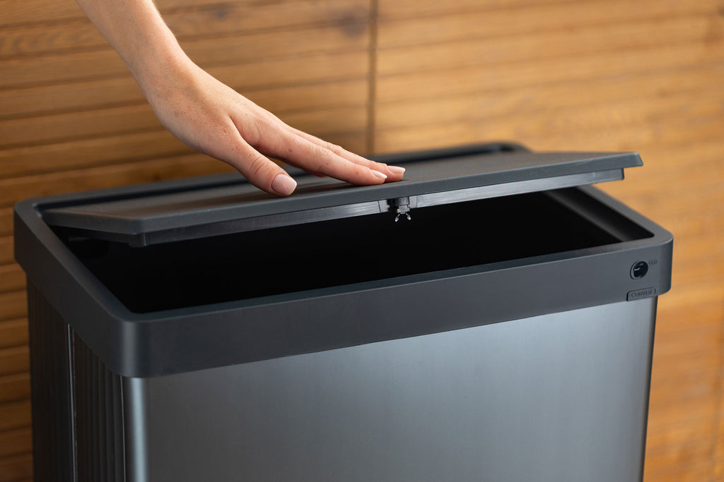 Dotata di un elegante rivestimento IML che le conferisce un aspetto moderno e raffinato, si integra perfettamente in ogni ambiente. Il bordo copri sacco integrato assicura un aspetto sempre ordinato, mentre i piedini antiscivolo garantiscono stabilità su qualsiasi superficie. Il montaggio è semplice e veloce, non richiede attrezzi.