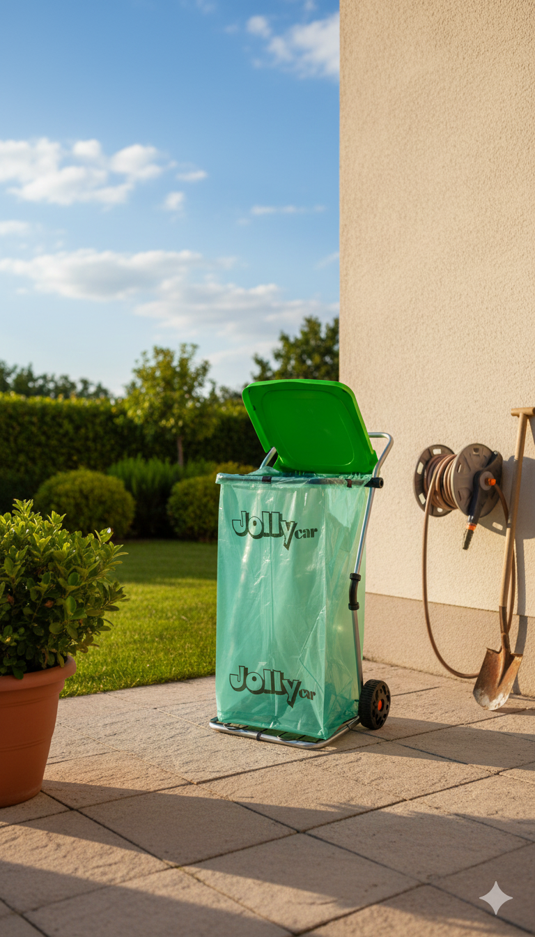 Sackkarre mit polyesterpulverbeschichtetem Stahlrahmen, ausgestattet mit Polypropylendeckel: Unverzichtbar im Garten zum Sammeln von Laub und Abfall, auch für den Hausgebrauch nützlich. Die Höhe des Taschenhalterrahmens ist dank der speziellen Gleitstifte einstellbar. Ein Abfallbeutel und die Clips zur Befestigung am Rahmen sind im Lieferumfang enthalten. Mit den Rädern können Sie den Wagen leicht dorthin bewegen, wo er am dringendsten benötigt wird. Einfache und schnelle Montage ohne Werkzeug.