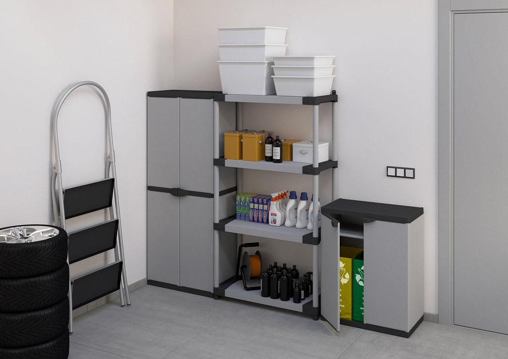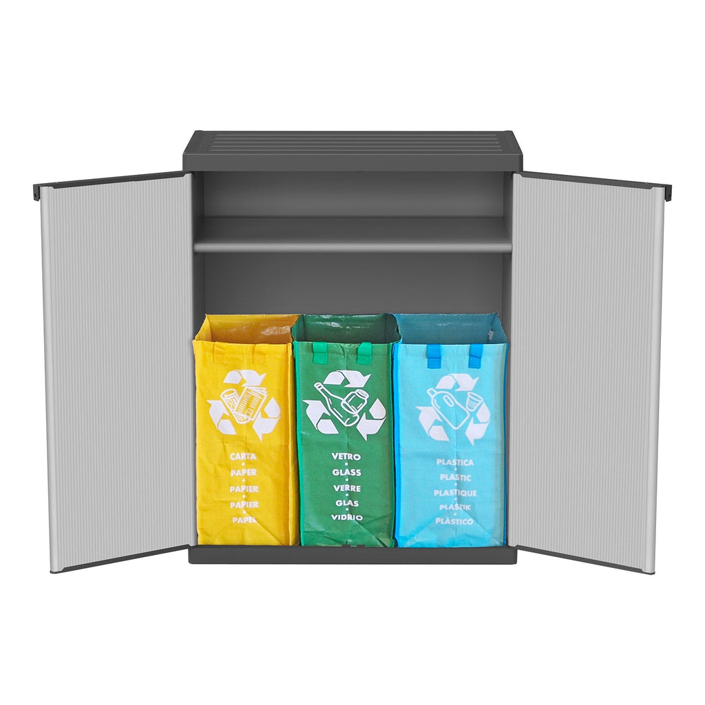 Abfalleimer 2 Türen 68x39,5x85 cm mit Taschen und grauem Regal
