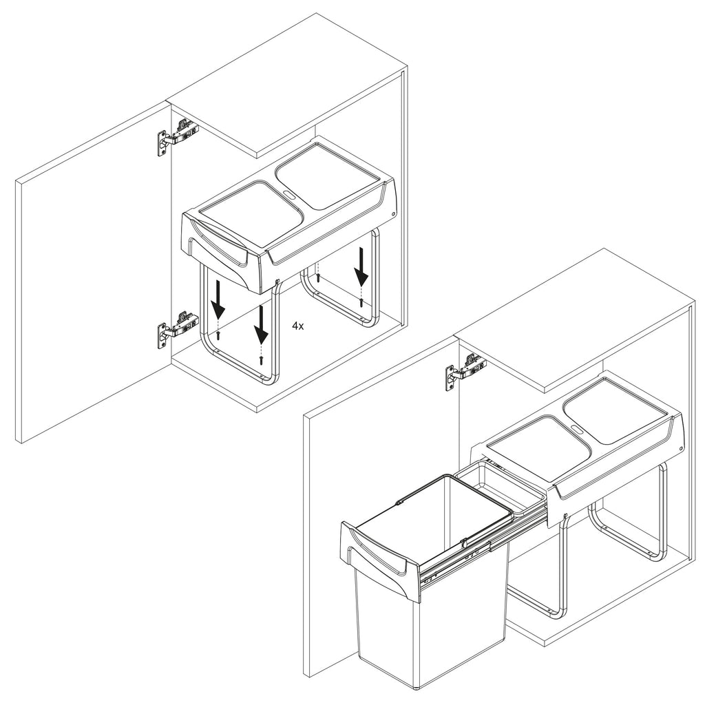 Herausnehmbarer Abfallsortierbehälter, ideal zum Recycling und Sortieren von Haushaltsabfällen. Sie sind so konzipiert, dass sie in Küchenschränke integriert werden können und einen leichteren Zugang zu den Mülleimern bieten. Es hat eine Gesamtkapazität von 20 Litern und gilt für Module mit den Mindestnutzmaßen von 264 mm Breite, 450 mm Tiefe und 395 mm Höhe .