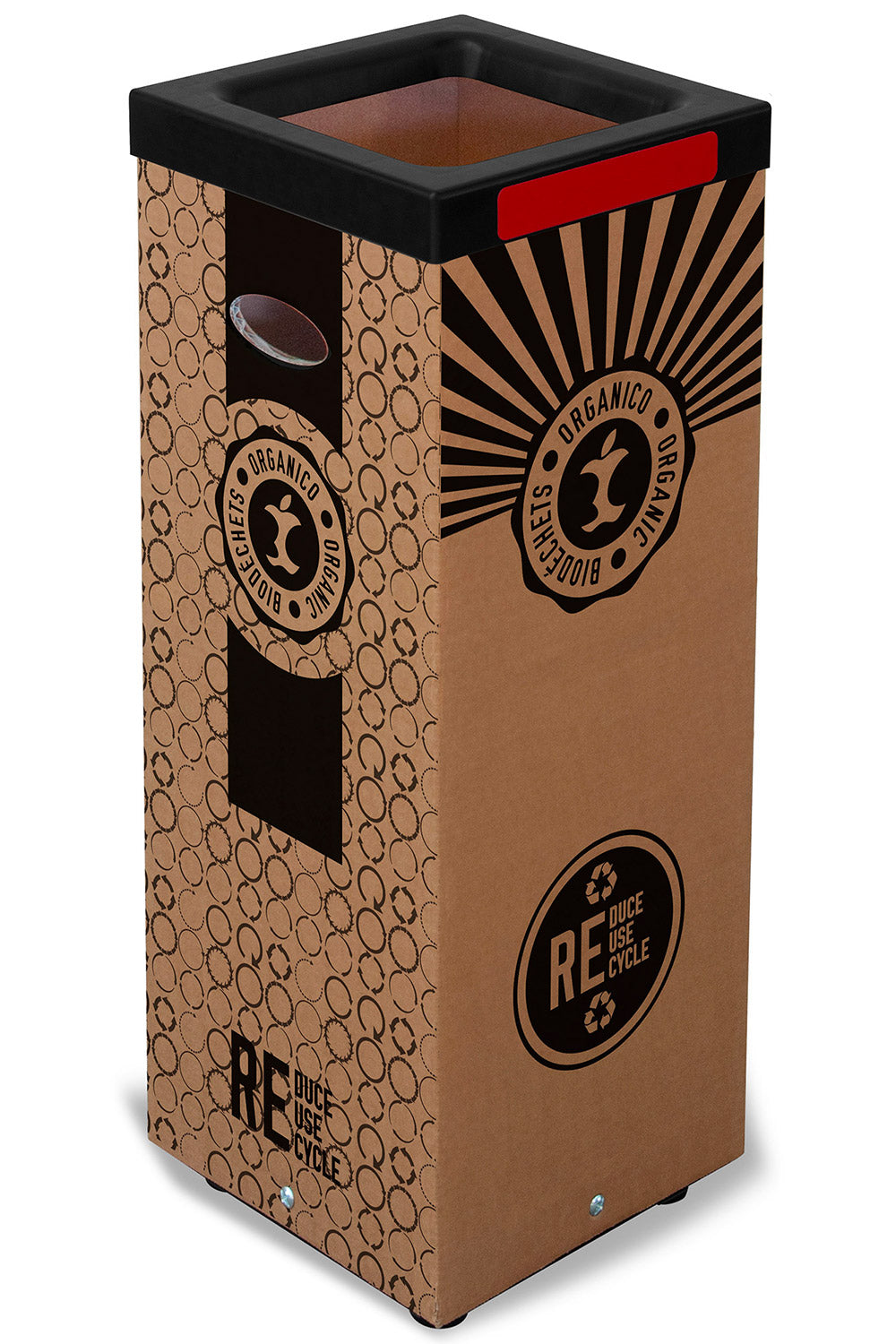 Contenitore per raccolta rifiuti realizzato in cartone 70% riciclato, spessore 7 mm. Stampa digitale realizzata direttamente sul materiale, grafica "organico". Cover superiore in plastica nera 100% riciclata. Kit quattro adesivi colorati incluso per differenziare la raccolta. Fondo in metallo verniciato nero. Piedi in gomma antigraffio. Articolo venduto smontato, dotato di istruzioni