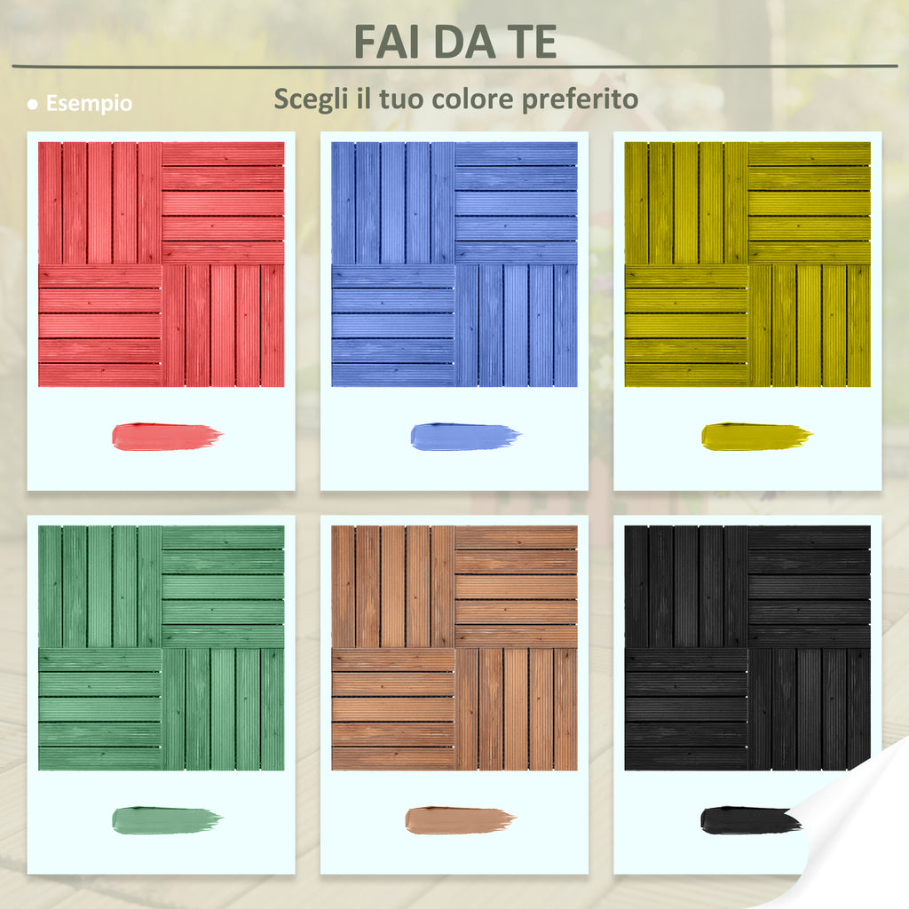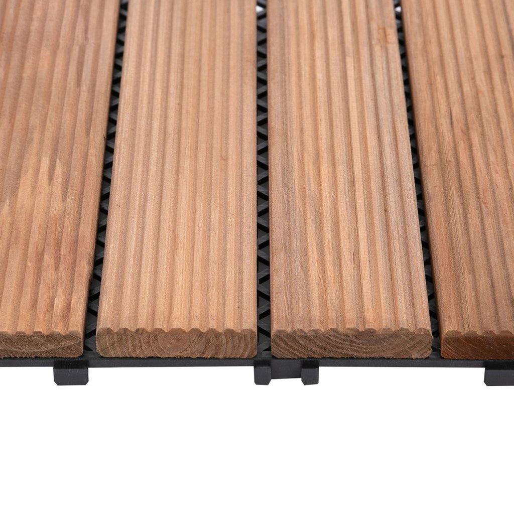 Mit dem Set aus 27 ineinandergreifenden Außenfliesen können Sie schnell und einfach Ihren eigenen Gartenboden bauen. Sie bestehen aus Massivholz und PVC, um im Laufe der Zeit zu widerstehen, und ihre Struktur ermöglicht Wasserablauf und Atmungsaktivität. Diese Gartenfliesen sind langlebig und rutschfest und können eine Fläche von 3? bedecken. Dank des praktischen Steckbausystems haben Sie Ihren Outdoor-Holzboden im Handumdrehen erstellt.