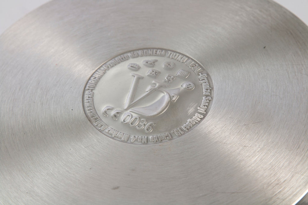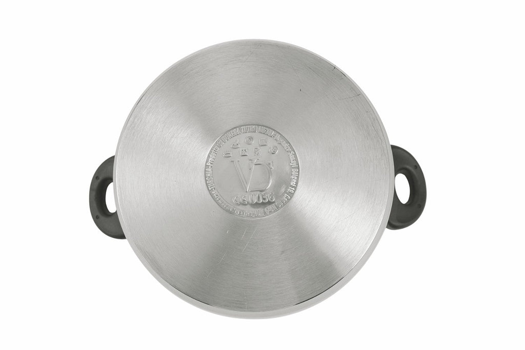 Es ist für alle Herdarten, einschließlich Induktion, geeignet und verfügt über eine dreifache Stahl-Aluminium-Stahl-Schicht, die eine gleichmäßige Wärmeausbreitung über die gesamte Oberfläche ermöglicht.