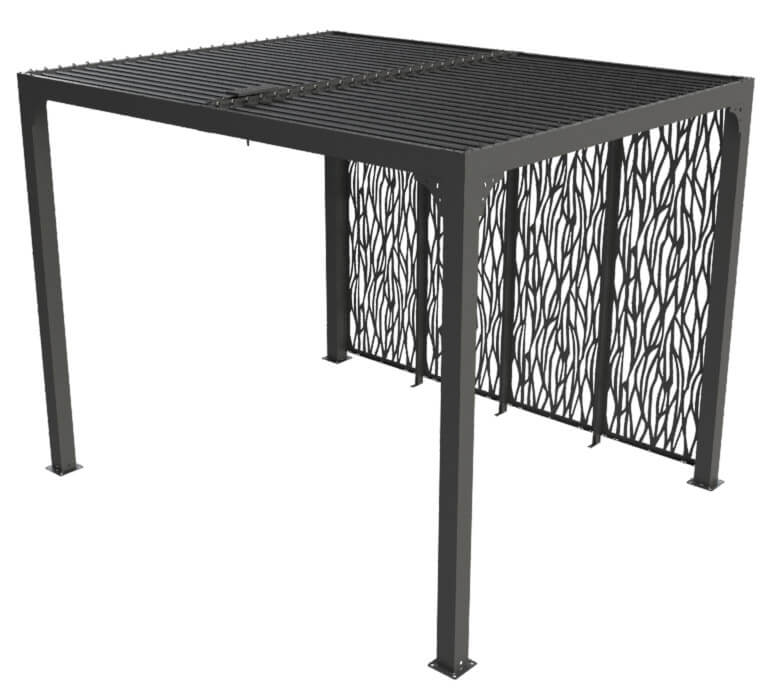 - Copertura: pannelli in alluminio 90 mm, spessore 1mm, colore grigio antracite, orientabili fino a 90°