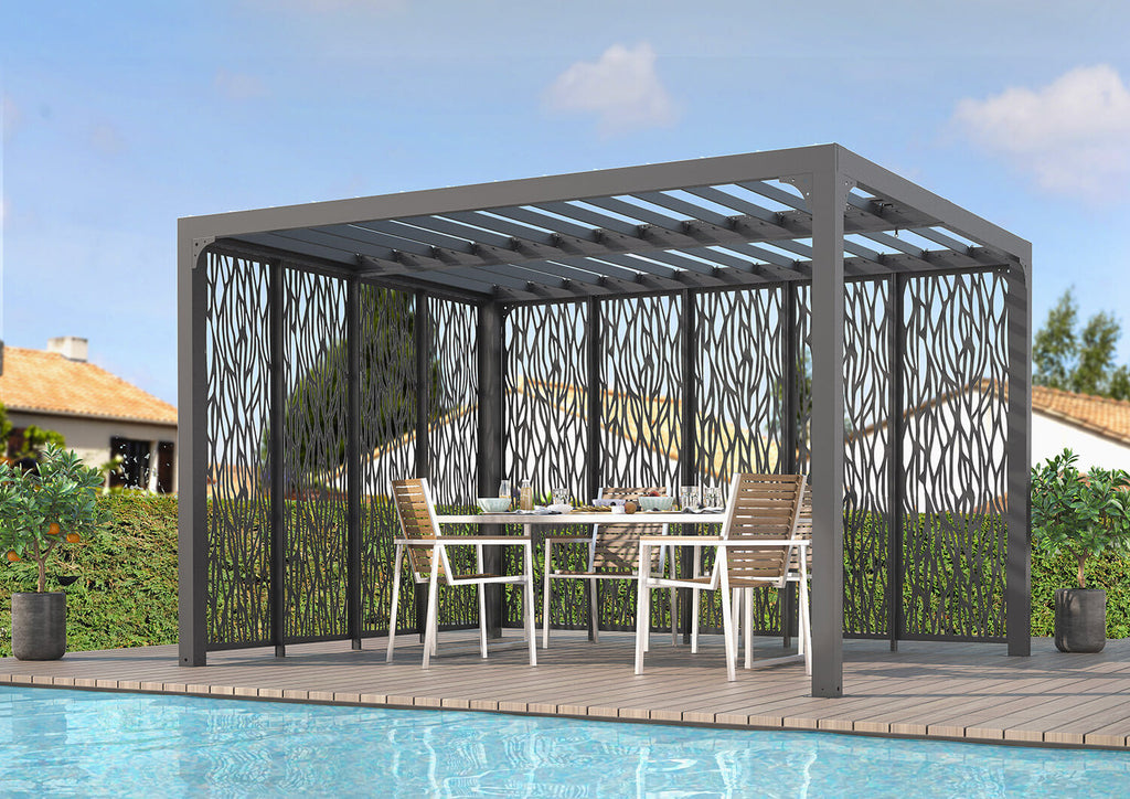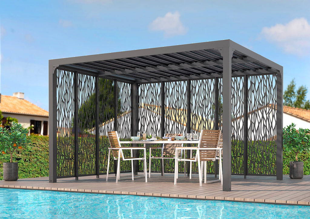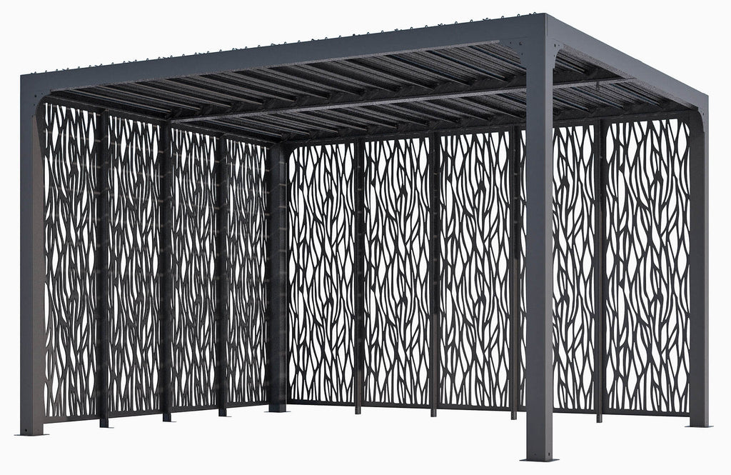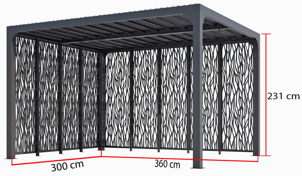 La pergola autoportante, è composta da una struttura e 78 pannelli parasole girevoli, non motorizzati, in alluminio 100%, verniciato a polvere. Tutti i pannelli sono ripartiti in 2 parti separate, offrendo la possibilità di apertura a 90°, per aprire e chiudere, con un solo gesto, i 2 lati, a seconda dell'intensità della luce desiderata. In posizione chiusa, il tetto offre protezione in caso di pioggia, con il suo sistema di trasferimento dell'acqua alle grondaie poste negli importi laterali. Posizionati sui lati da 3 e 3,6 metri, i pannelli mashrabiyya, costituiscono un dispositivo di ventilazione forzata naturale, (usato nell'architettura tradizionale dei Paesi arabi per accelerare il passaggio del vento). I pannelli mashrabiyya, in acciaio epoxy spessore 1mm, ognuno indipendente, sono termolaccato con il palo di fissaggio, hanno superficie piana traforata a forme vegetali, su una cornice di 2,50m, molto resistente e durevole. Molto semplice da montare grazie alle sue istruzioni dettagliate e alle sue parti numerate.