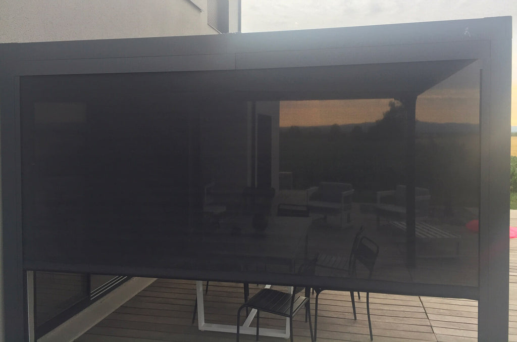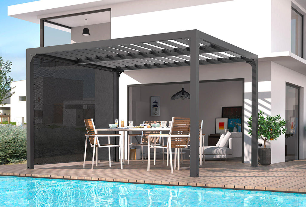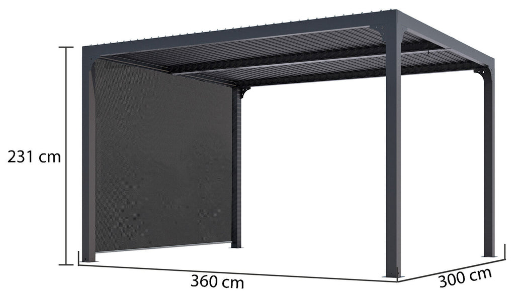 La pergola autoportante, è composta da una struttura e 78 pannelli parasole girevoli, non motorizzati, in alluminio 100%, verniciato a polvere. Tutti i pannelli sono ripartiti in 2 parti separate, offrendo la possibilità di apertura a 90°, per aprire e chiudere, con un solo gesto, i 2 lati, a seconda dell'intensità della luce desiderata. In posizione chiusa, il tetto offre protezione in caso di pioggia, con il suo sistema di trasferimento dell'acqua alle grondaie poste negli importi laterali. Inoltre dispone di una Tenda sul lato da 3 metri, avvolgibile manualmente. Molto semplice da montare grazie alle sue istruzioni dettagliate ed alle sue parti numerate.