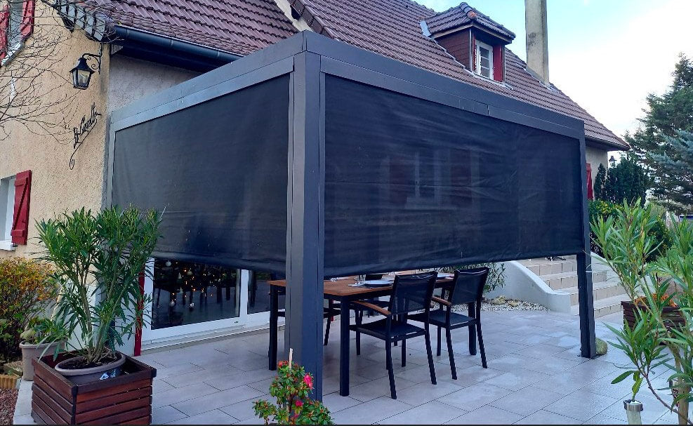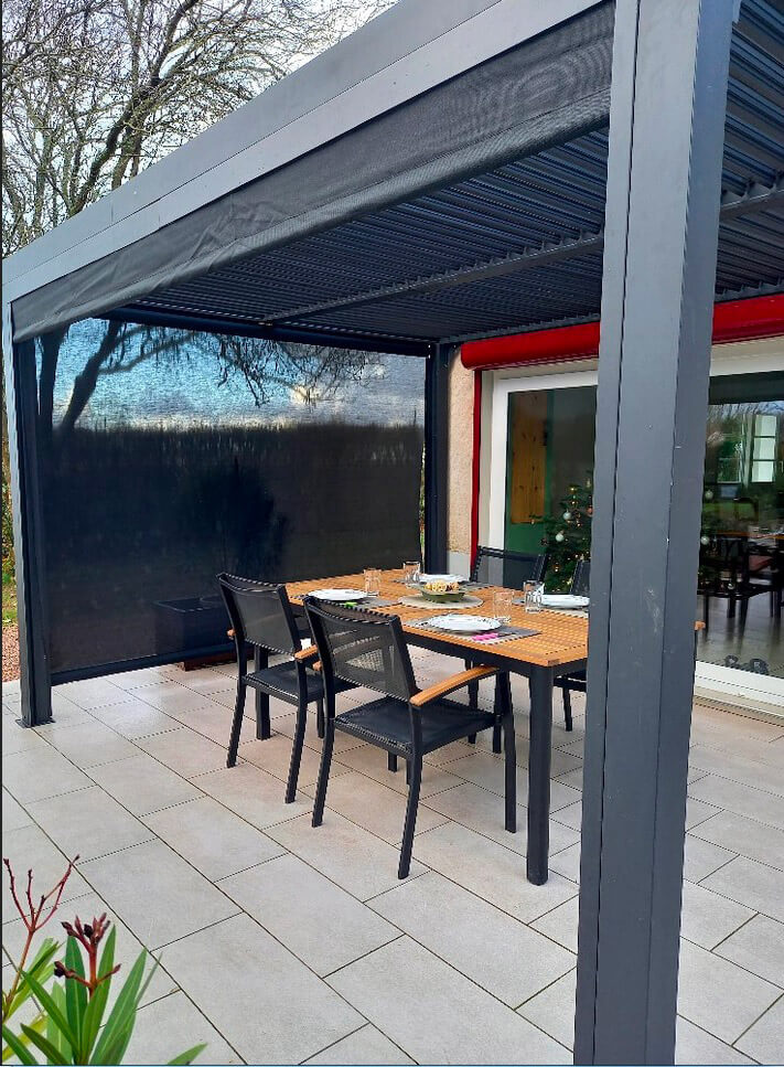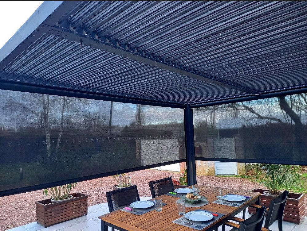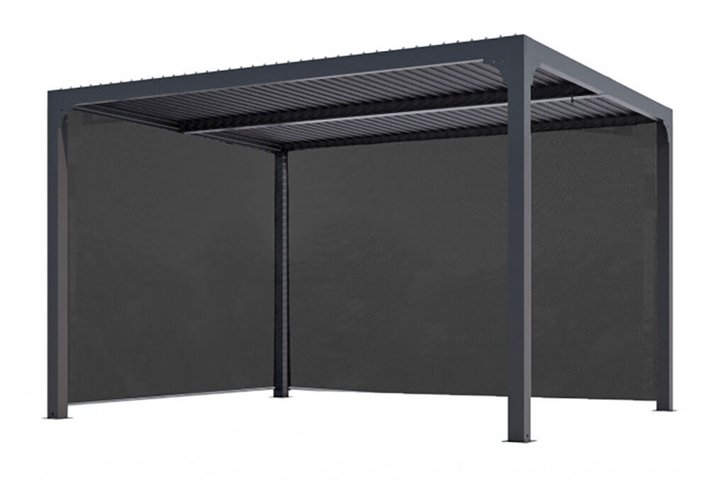 - Copertura: pannelli in alluminio 90 mm, spessore 1mm, colore grigio antracite, orientabili fino a 90°, dotati di manovella per apri-chiudi manuale
