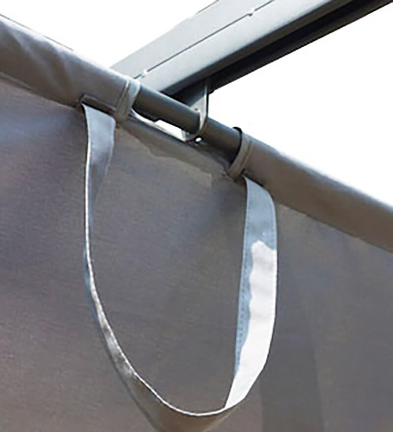 - Fornito di: 4 pali dimensione 10 x 10 cm, spess 1,2 mm, placche di fissaggio a terra 16 x 16 cm spessore 3 mm, Maniglie per apertura e chiusura della tela, Fascia frontale e posteriore di protezione