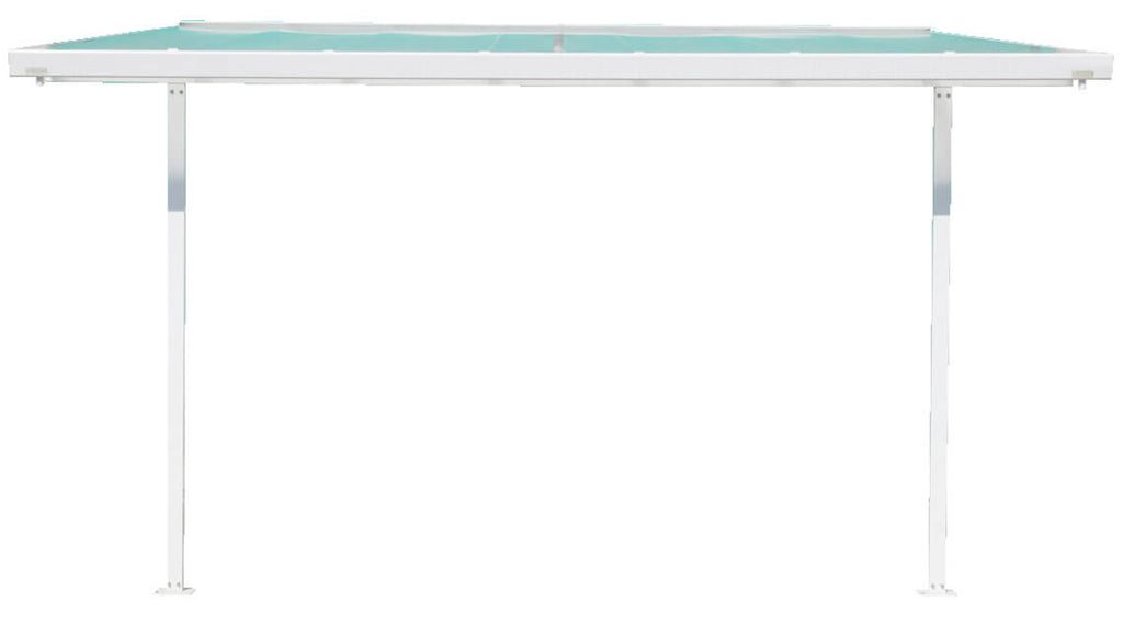 Pergola-Außenmarkise aus UV-beständigem Polycarbonat mit weißer Aluminiumstruktur zur Befestigung am Boden.
