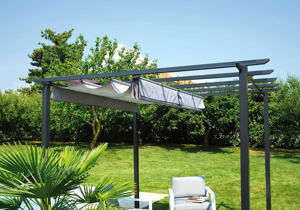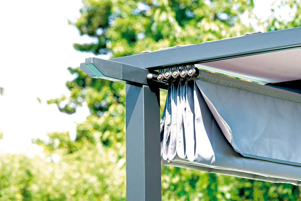 Gartenpergola aus Aluminium, quadratisch, 3 x 3 m, Vorghini-Ketten, Anthrazit und Grau, mit Schiebedach