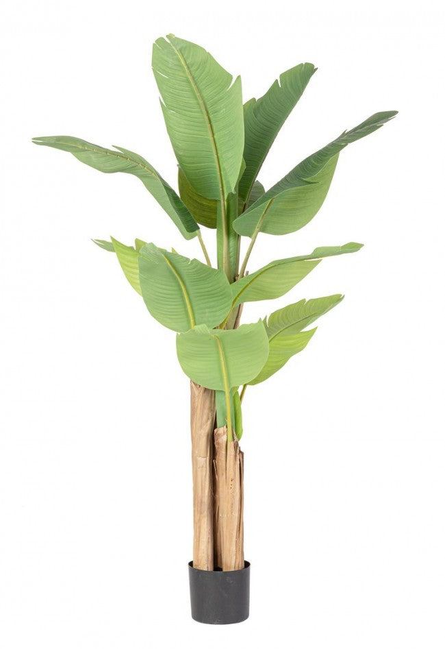 La pianta artificiale è composta da foglie in gomma, tronco in legno e corteccia di banana e poliuretano, con supporto metallico. Il vaso è realizzato in plastica, e il contenuto del vaso è in cemento per garantire stabilità. Questa combinazione di materiali crea un'imitazione realistica e durevole di una pianta, perfetta per aggiungere un tocco di verde senza la necessità di manutenzione regolare. Il mix di foglie, tronco e materiali di supporto rende la pianta artificiale un elemento decorativo stabile e attraente per vari ambienti.