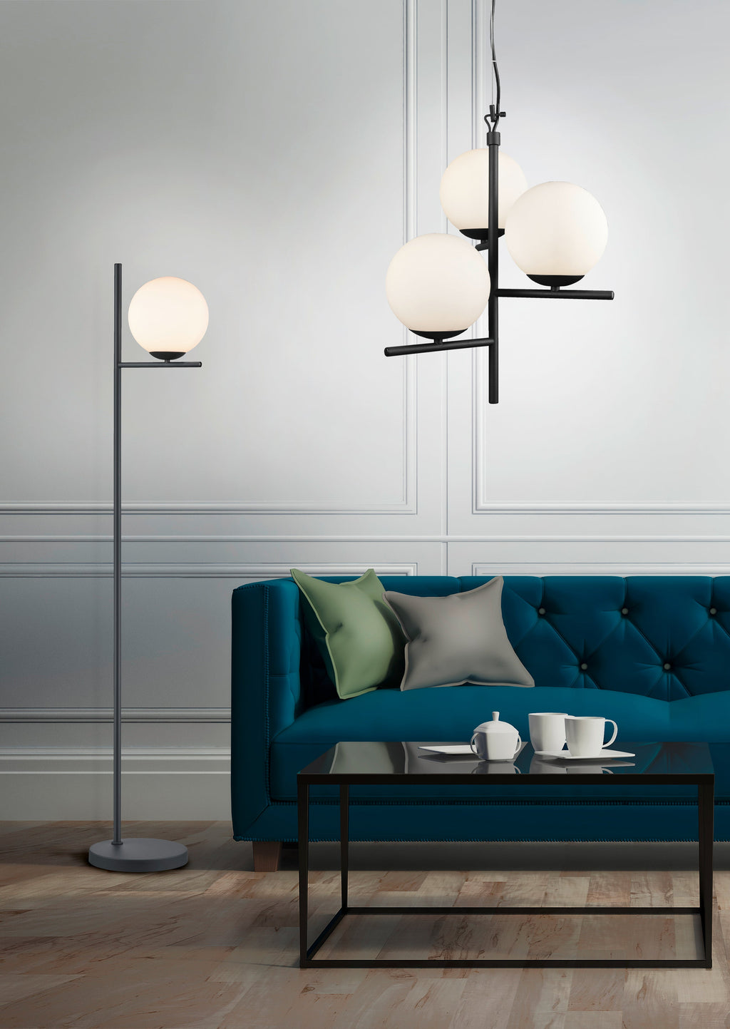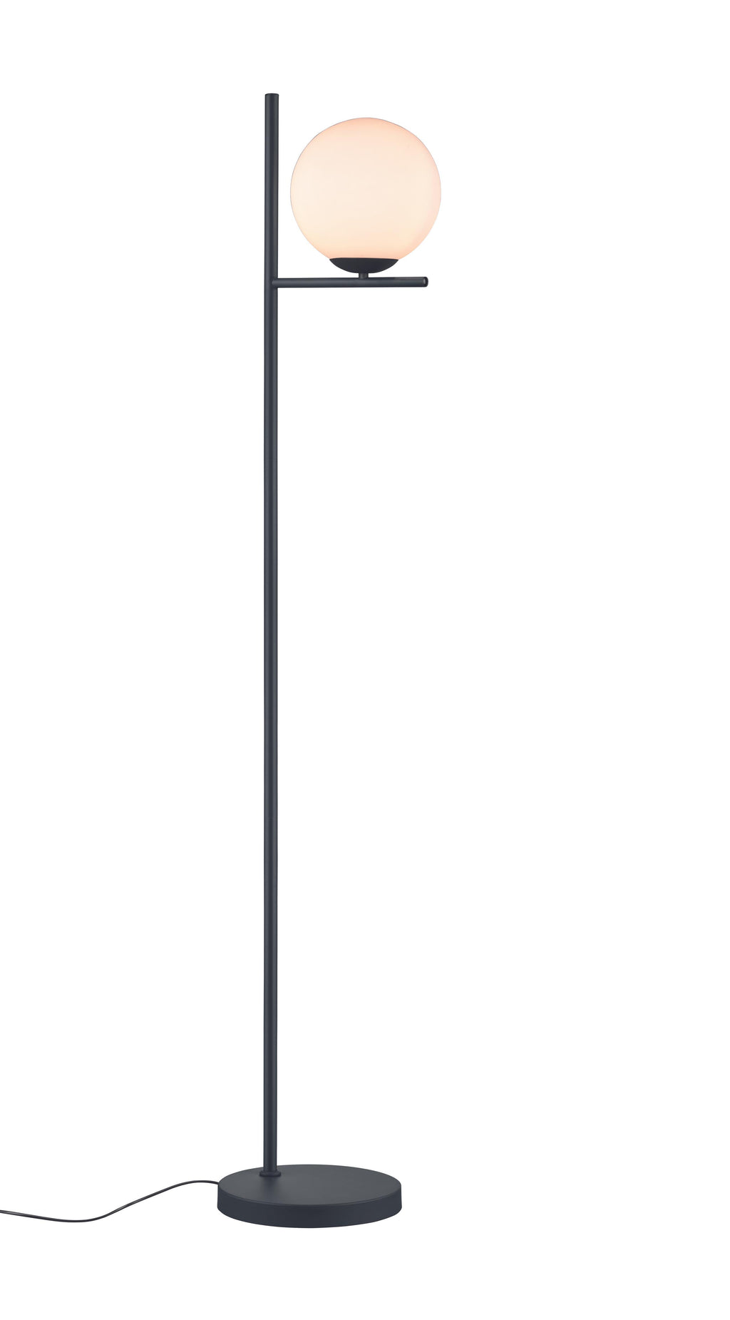 Stehlampe aus rein schwarzem Metall mit weißer Kugel H. 150 cm