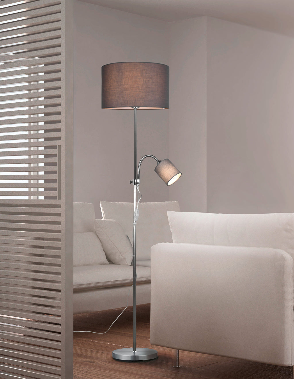 Owen Stehlampe Metall Satinierter Stahl mit Leselampe und 2 Lampenschirmen mit separaten Schaltern D. 36 cm Höhe 160 cm