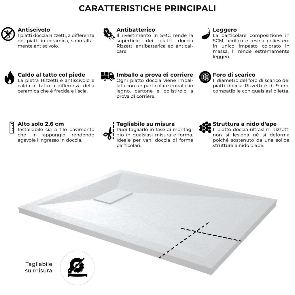 Die Duschwanne besteht aus ultradünnem SMC, einem Material, das sie schön, warm und modern macht, während die Steinoptik-Oberfläche dem Produkt nicht nur ein ästhetisches Aussehen von großem Wert verleiht, sondern auch seine rutschfesten und typischen Eigenschaften garantiert Weichheit im Griff. Darüber hinaus ist dieses Material aufgrund seiner Verarbeitungseigenschaften in der Lage, im Gegensatz zu typischen Keramikplatten, die schnell auskühlen, eine angenehme Oberflächenwärme aufrechtzuerhalten.