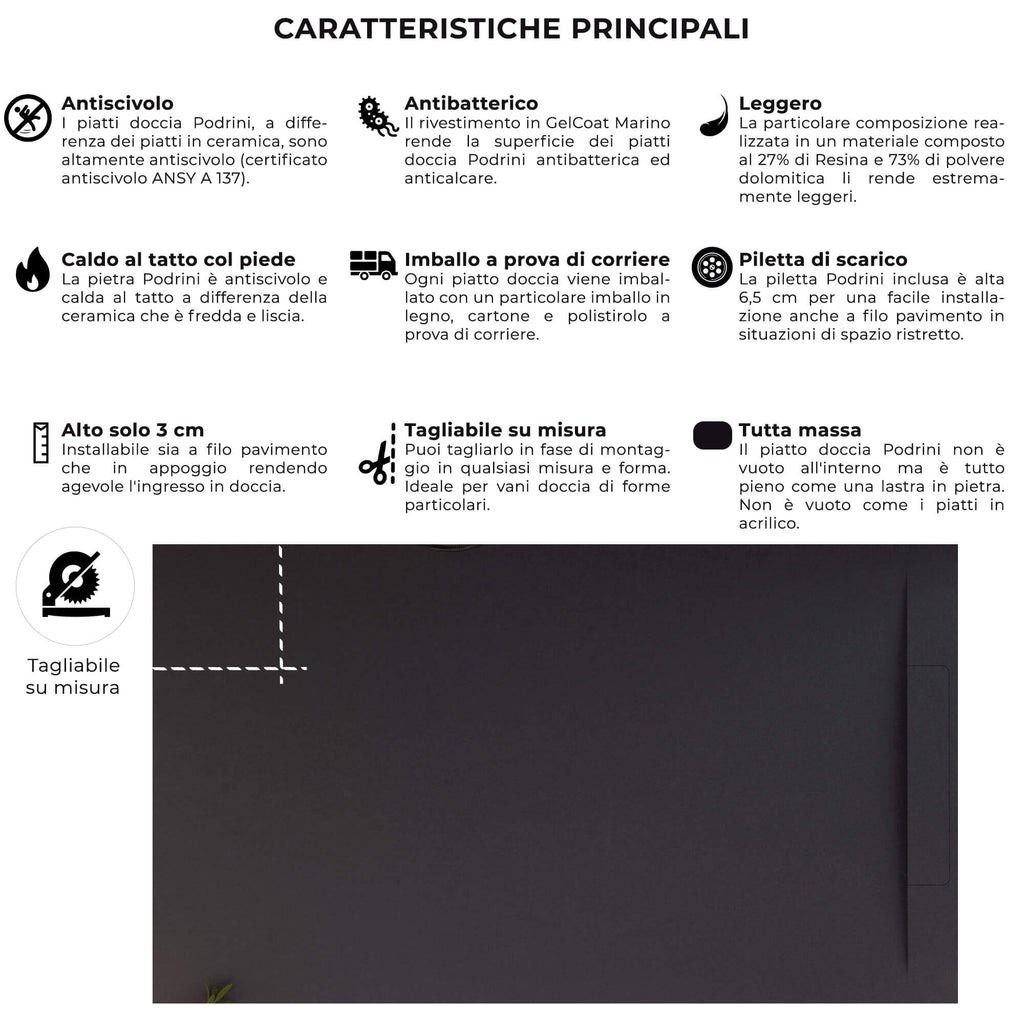 Die Calcutta-Duschwannen sind dank des 1 mm dicken Schutzes aus antibakteriellem Sanitär-Marine-Gelcot, dem gleichen Material, das zur Abdeckung der Bootsrümpfe verwendet wird, jedoch weiter gehärtet, sehr kratzfest, um eine maximale Beständigkeit gegen Kratzer und UV-Strahlen zu gewährleisten wasserdicht, bietet ein warmes Gefühl am Fuß .