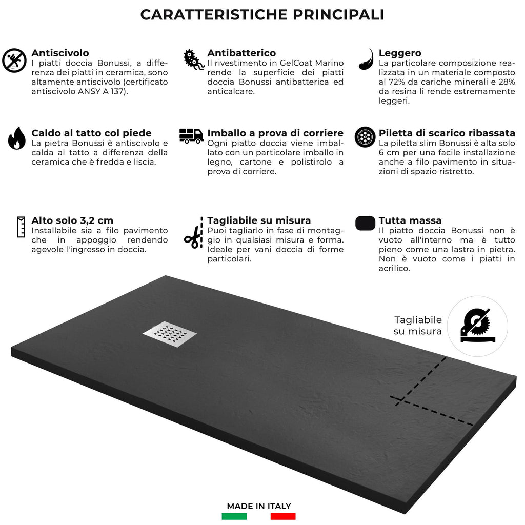 Die Bonussi Ardesia Stone Duschwannen sind ein Symbol für die Exzellenz der italienischen Handwerkskunst , sie bieten die Solidität und Langlebigkeit, die nur Made in Italy- Produkte gewährleisten