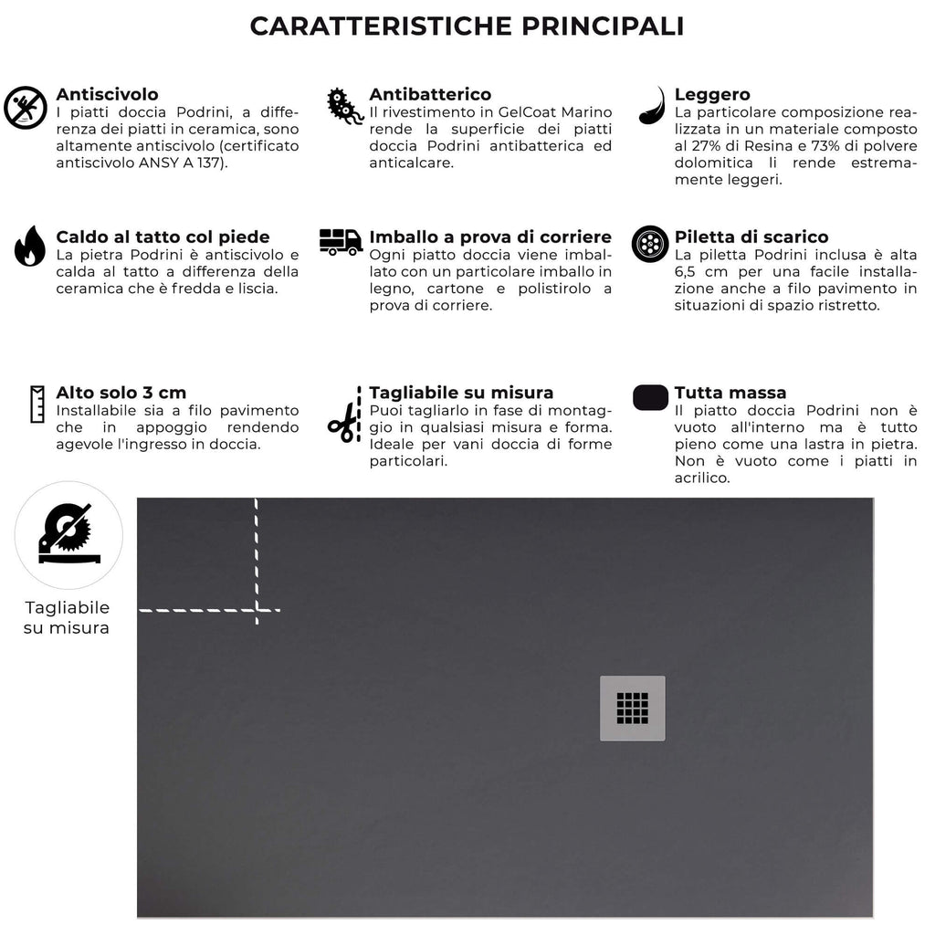 Bonussi Everest Ardesia Duschwannen sind sehr kratzfest, dank des 1 mm dicken Schutzes aus antibakteriellem Sanitär-Marine-Gelcot , dem gleichen Material, das zur Abdeckung der Bootsrümpfe verwendet wird, aber wenn es weiter gehärtet wird, sorgt es für maximale Beständigkeit gegen Kratzer und UV-Strahlen und wasserdicht sind, bietet es ein warmes Gefühl am Fuß .