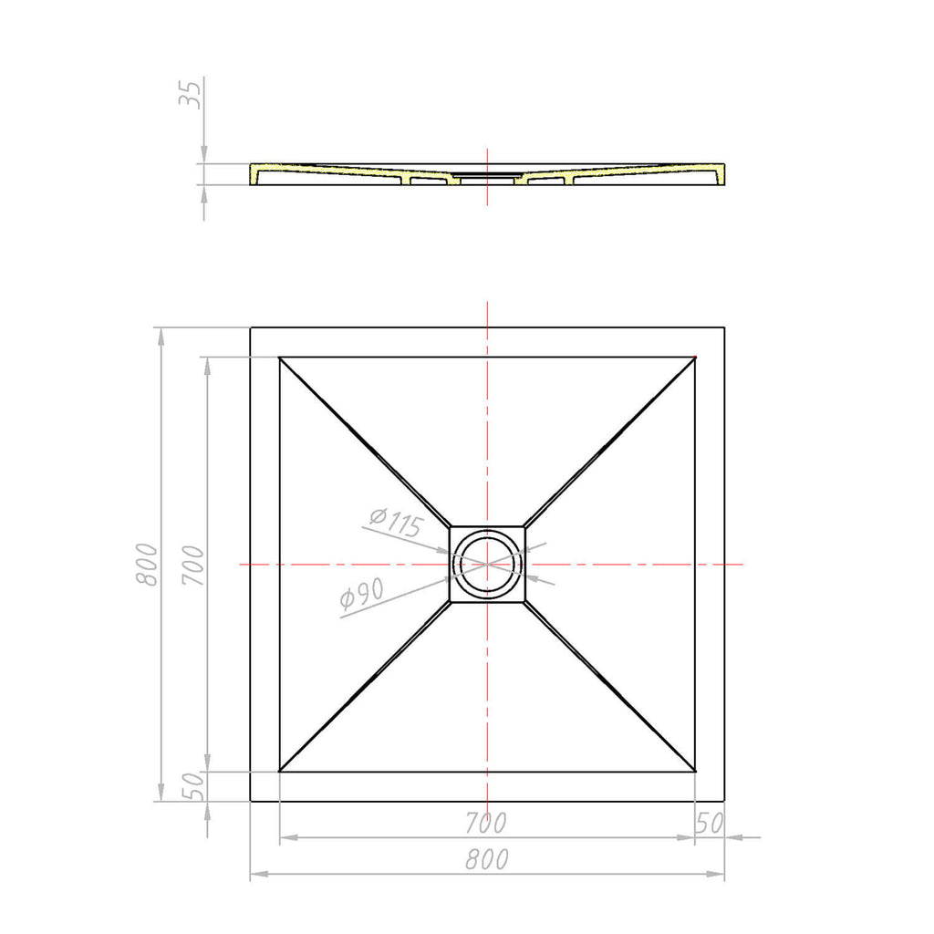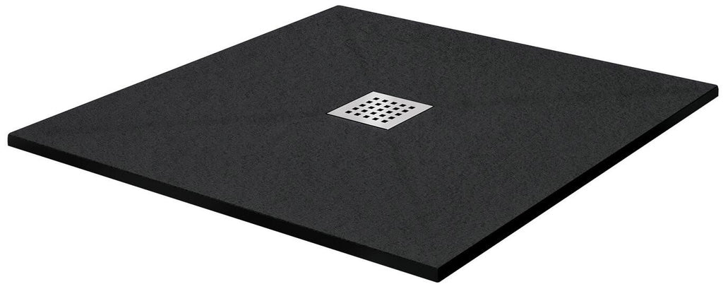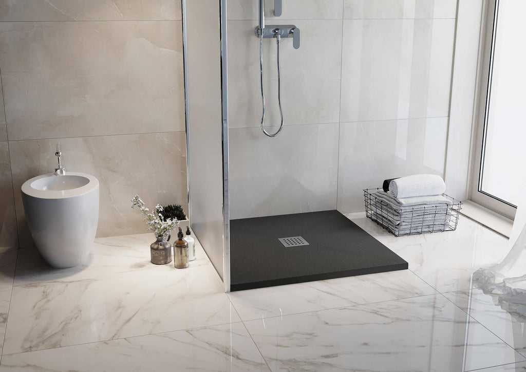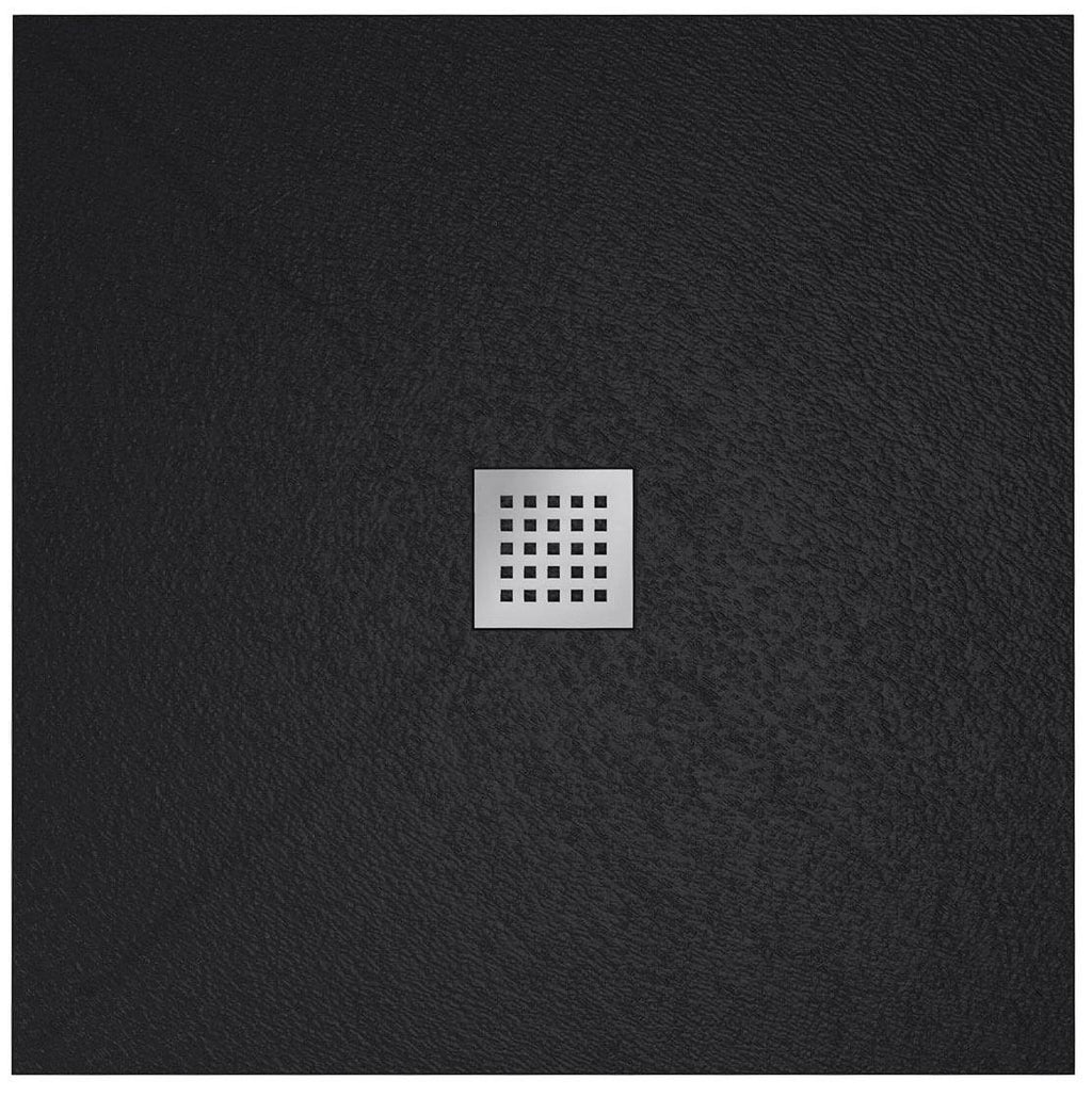 - Duschwanne 70x70 aus Marmorharz in Steinoptik mit Ablaufabdeckung aus anthrazitfarbenem Edelstahl
