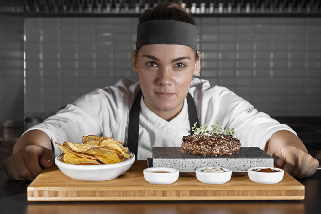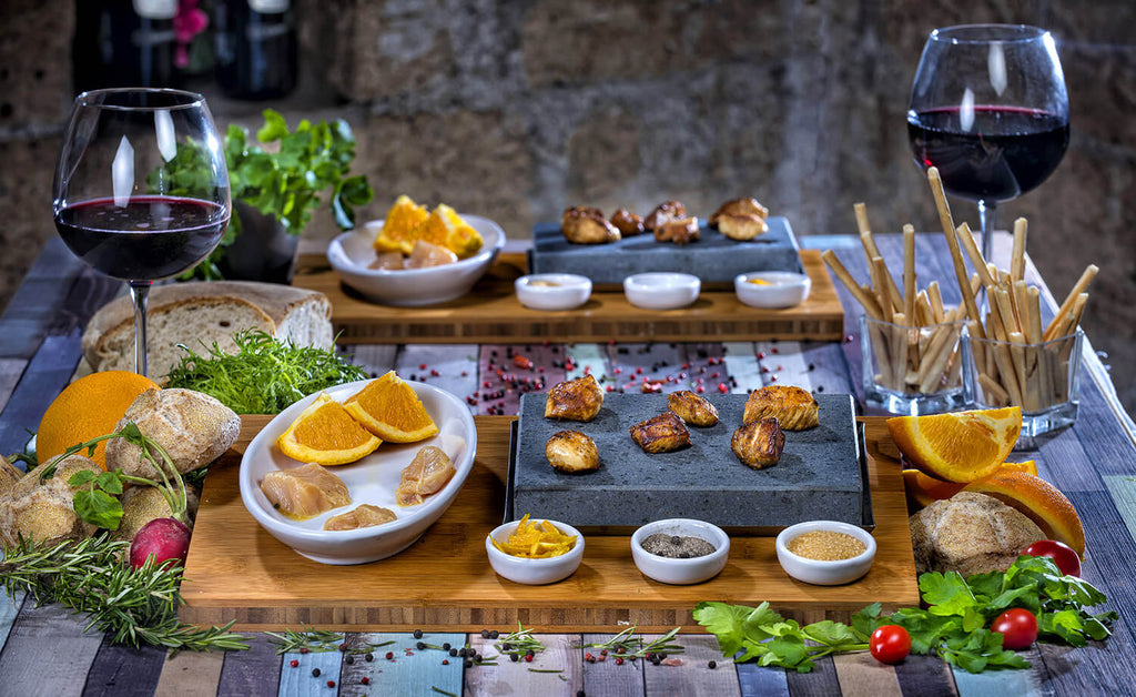 Lavasteinplatte mit Salatschüssel und 4 Schalen zum Kochen direkt am Tisch geeignet. Ausgestattet mit 1 Aluminiumtablett und einem Bambusholzsockel. Ideal als Einzelerlebnis.