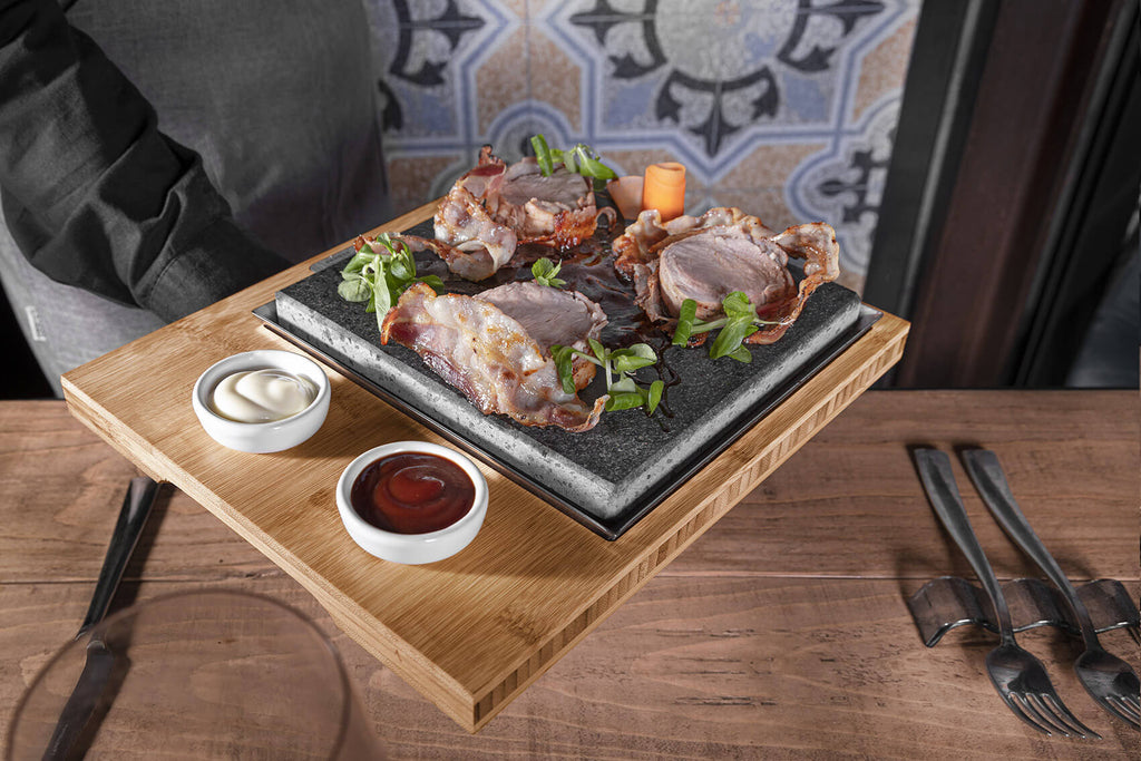 Lavasteinplatte mit Schalen zum Kochen direkt am Tisch geeignet. Ausgestattet mit 1 Aluminiumtablett und einem Bambusholzsockel. Ideal als Mitteltisch für bis zu 2 Personen.