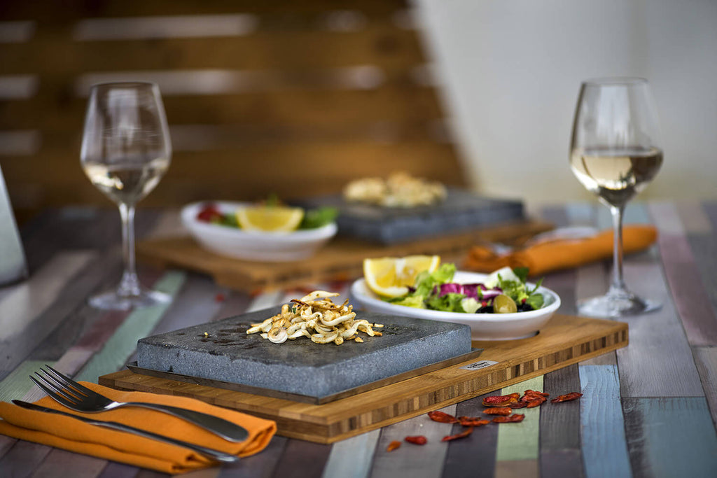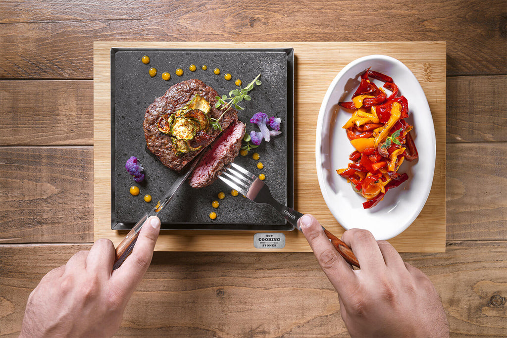 Lavasteinplatte mit Salatschüssel geeignet zum Kochen direkt am Tisch. Ausgestattet mit 1 Aluminiumtablett und einem Bambusholzsockel. Ideal als Einzelerlebnis.