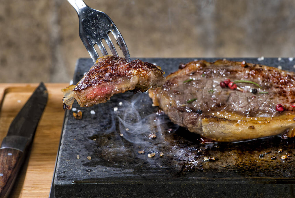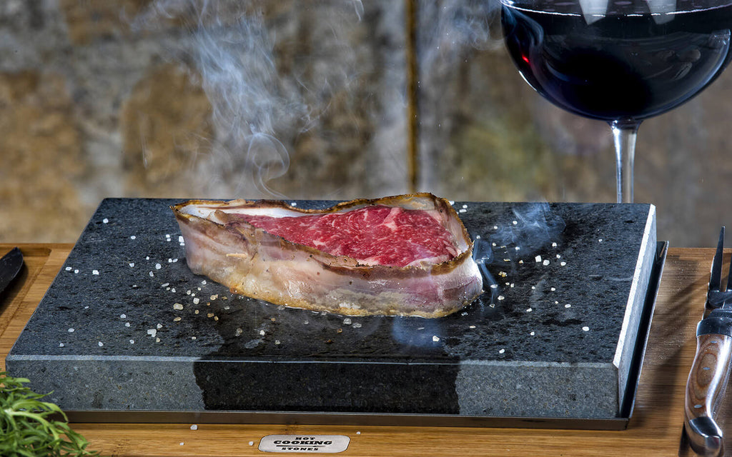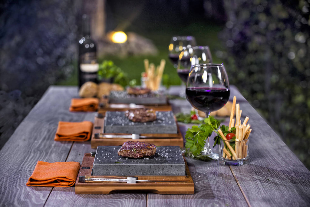Lavasteinplatte mit Besteck geeignet zum Kochen direkt am Tisch. Ausgestattet mit 1 Aluminiumtablett und einem Bambusholzsockel. Ideal als Einzelerlebnis.